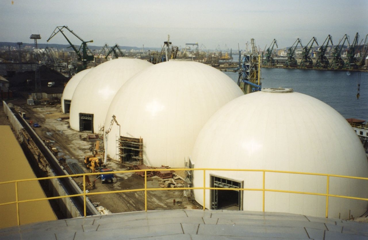 - silosy kopułowe typu „Dome”: 2 silosy o średnicy 42m i wysokości 25m (20.000 m3 pojemności każdy) oraz 2 silosy o średnicy 32m i wysokości 20m (10.000 m3 pojemności każdy),
