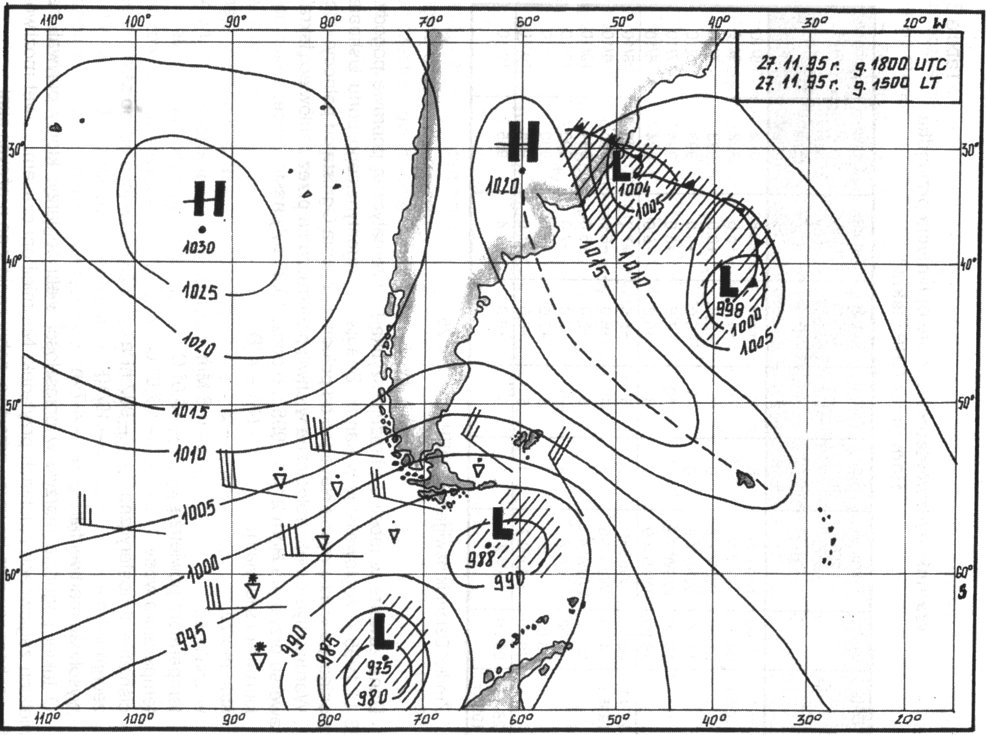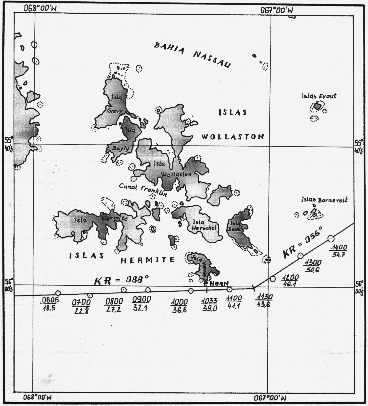 Miesięczny pobyt na południowej części Oceanu Spokojnego nie był łatwy. Trasę z Wellington (stolicy Nowej Zelandii) do przylądka Horn liczącą 4731 Mm, prowadzącą w słynnych „ryczących czterdziestkach” i „wyjących pięćdziesiątkach”, pokonaliśmy w 29 dni. Tylko w ciągu 4 dni tego przejścia w dziennikach okrętowych nie odnotowano sztormowego wiatru. Dwa razy, podczas tej drogi, sztormy osiągały siłę 12ºB, czyli moc huraganu.