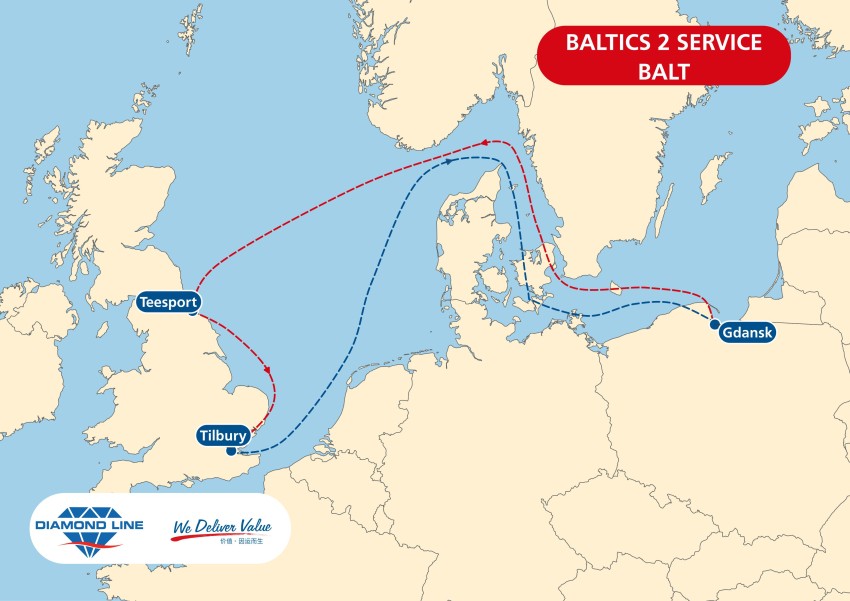 Firma żeglugowa Diamond Line, należąca do COSCO SHIPPING Lines, dodaje do swoich sieci usług dowozowych kolejne połączenia Intra Europe. Dostępna będzie trasa biegnąca z Baltic Hub w Porcie Gdańsk do brytyjskich portów Teesport i Tilbury.