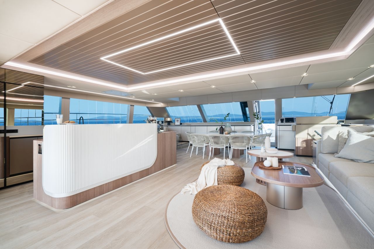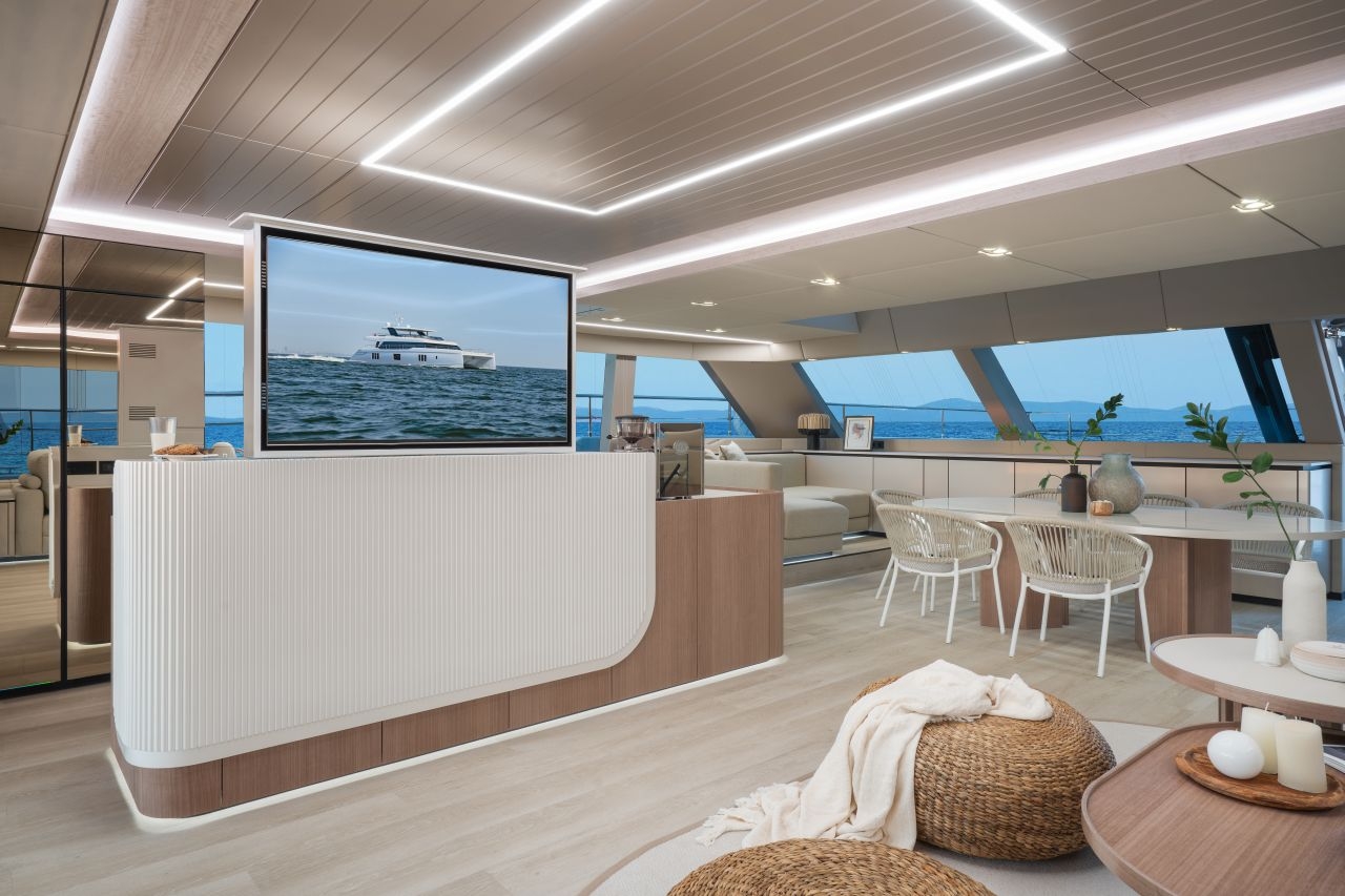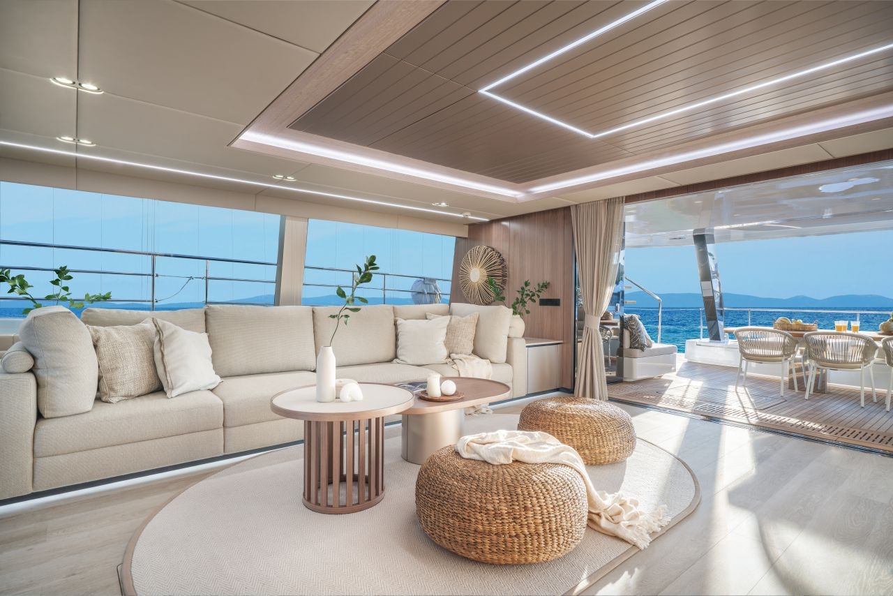 Na prawej burcie umieszczona została przestrzeń wypoczynkowa z dużą sofą i specjalnie zaprojektowanymi stolikami kawowymi. Przy tarasie frontowym jest także jadalnia przeznaczona dla 8 osób i miejsce do wypoczynku z kanapą w kształcie litery L.