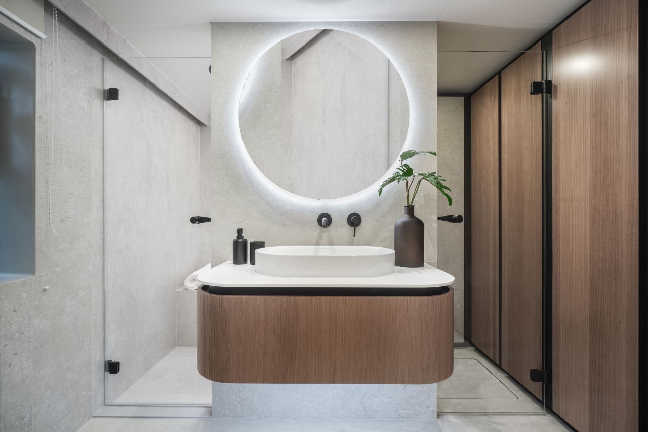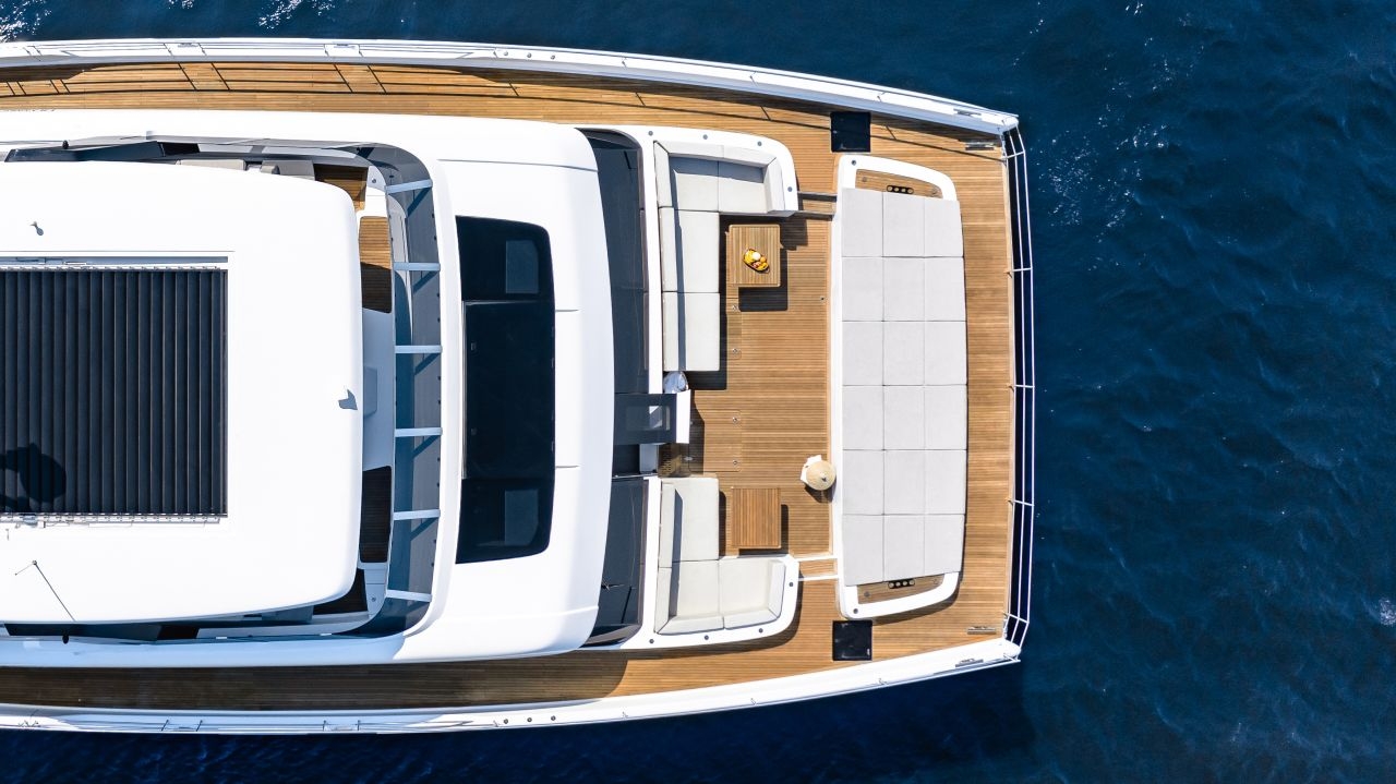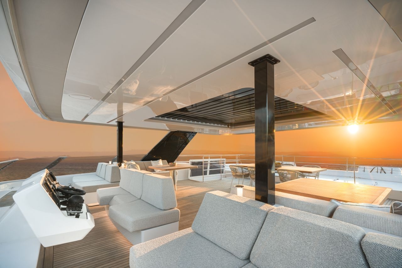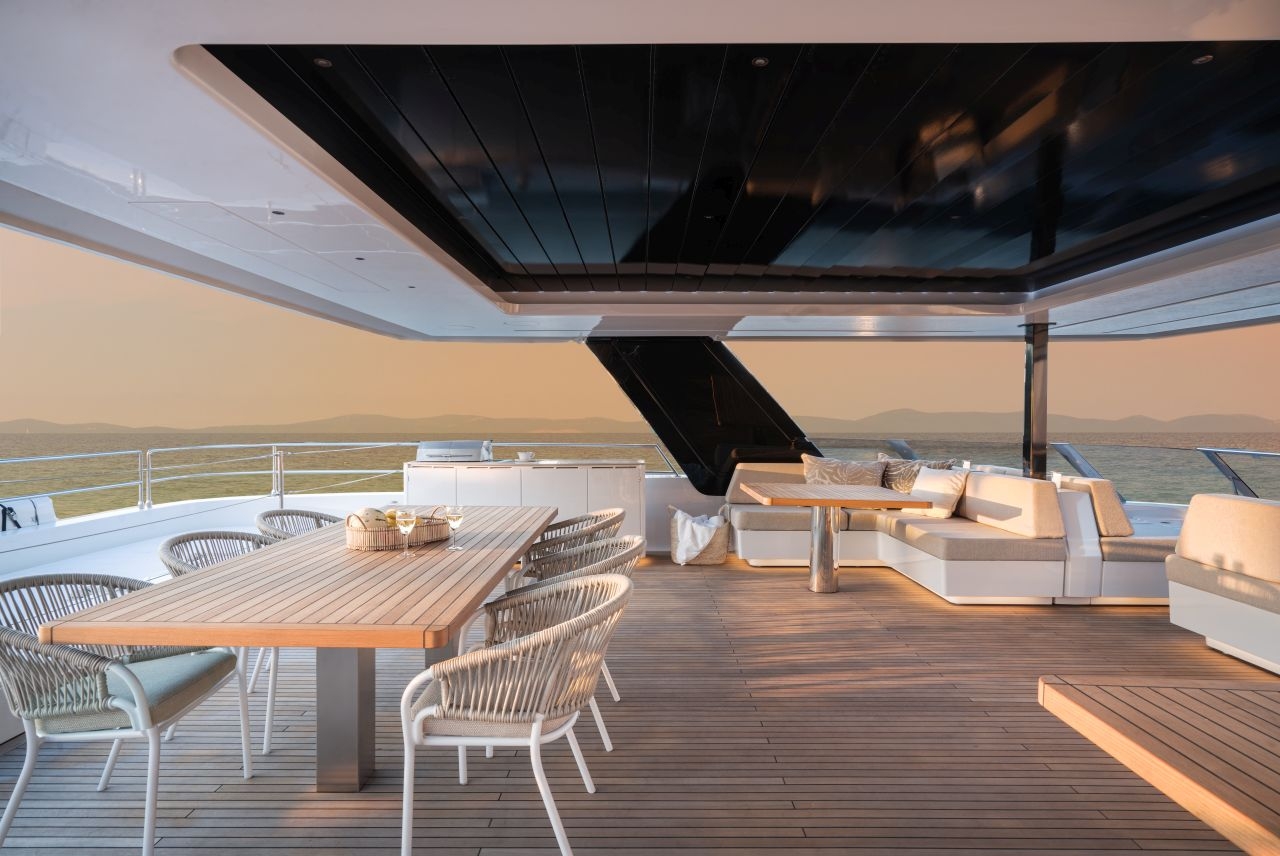 Na prawej burcie umieszczona została przestrzeń wypoczynkowa z dużą sofą i specjalnie zaprojektowanymi stolikami kawowymi. Przy tarasie frontowym jest także jadalnia przeznaczona dla 8 osób i miejsce do wypoczynku z kanapą w kształcie litery L.