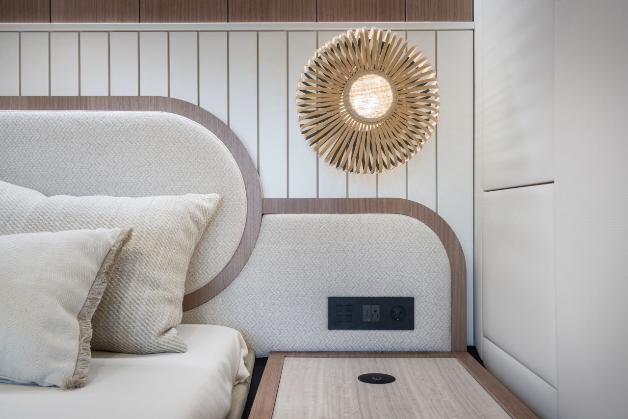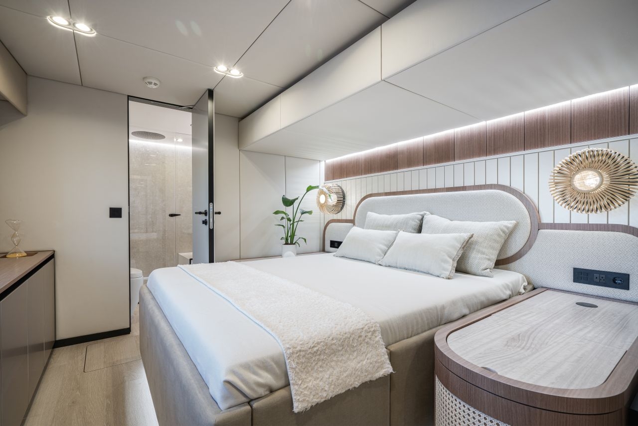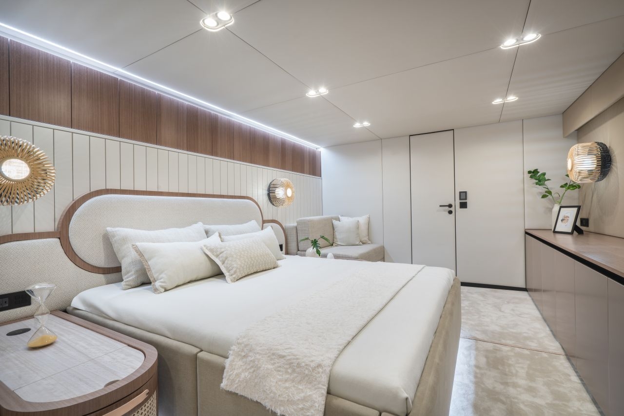 W obszernej kabinie właściciela znalazło się łóżko king-size, sofa, garderoba, duża łazienka, kabina VIP i dwie duże kabiny gościnne, wszystkie utrzymane w plażowym stylu z rattanowymi elementami wykończenia. Kokpit rufowy Kokomo rozciąga się na całą szerokość jednostki. Oferuje przestrzeń do wypoczynku. Pod nią znajduje się garaż, w którym może znaleźć się m.in. skuter wodny, oraz stacja do tankowania. W kokpicie znajduje się także duży stół i leżaki.