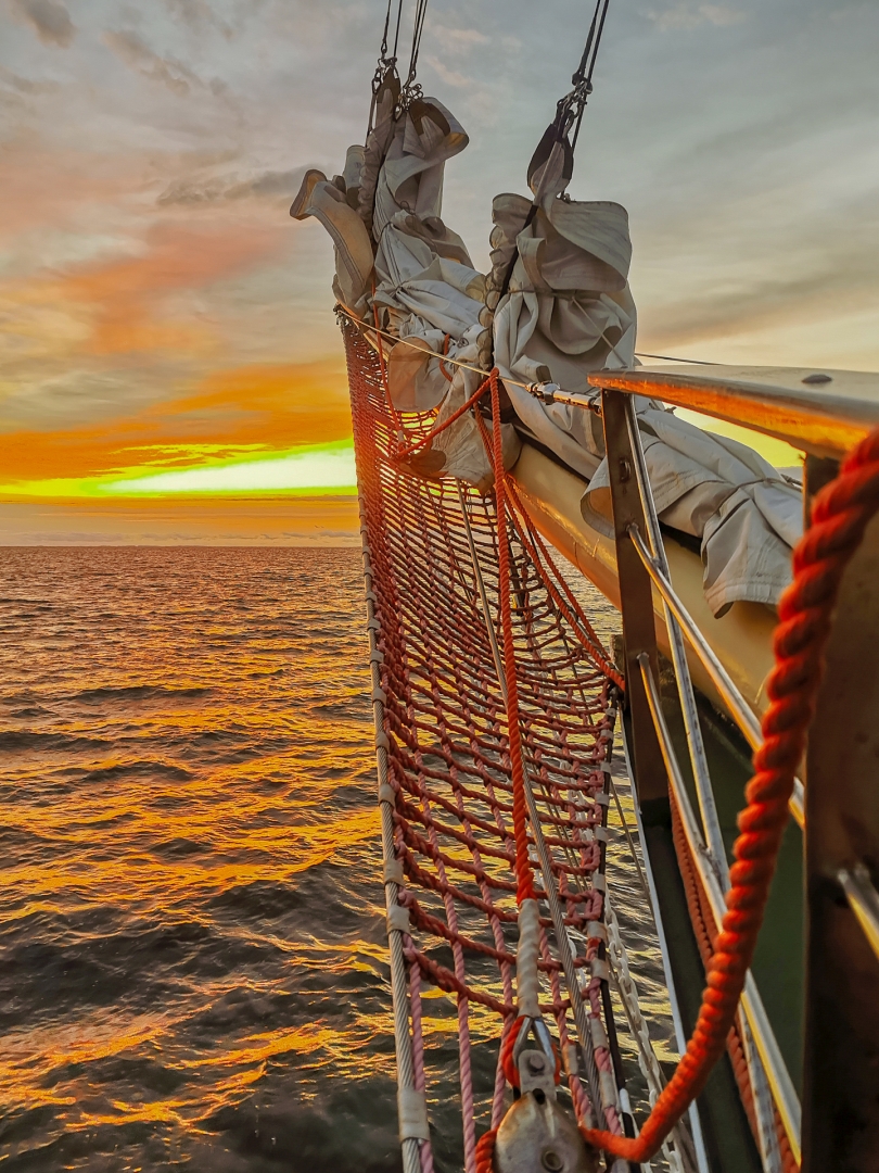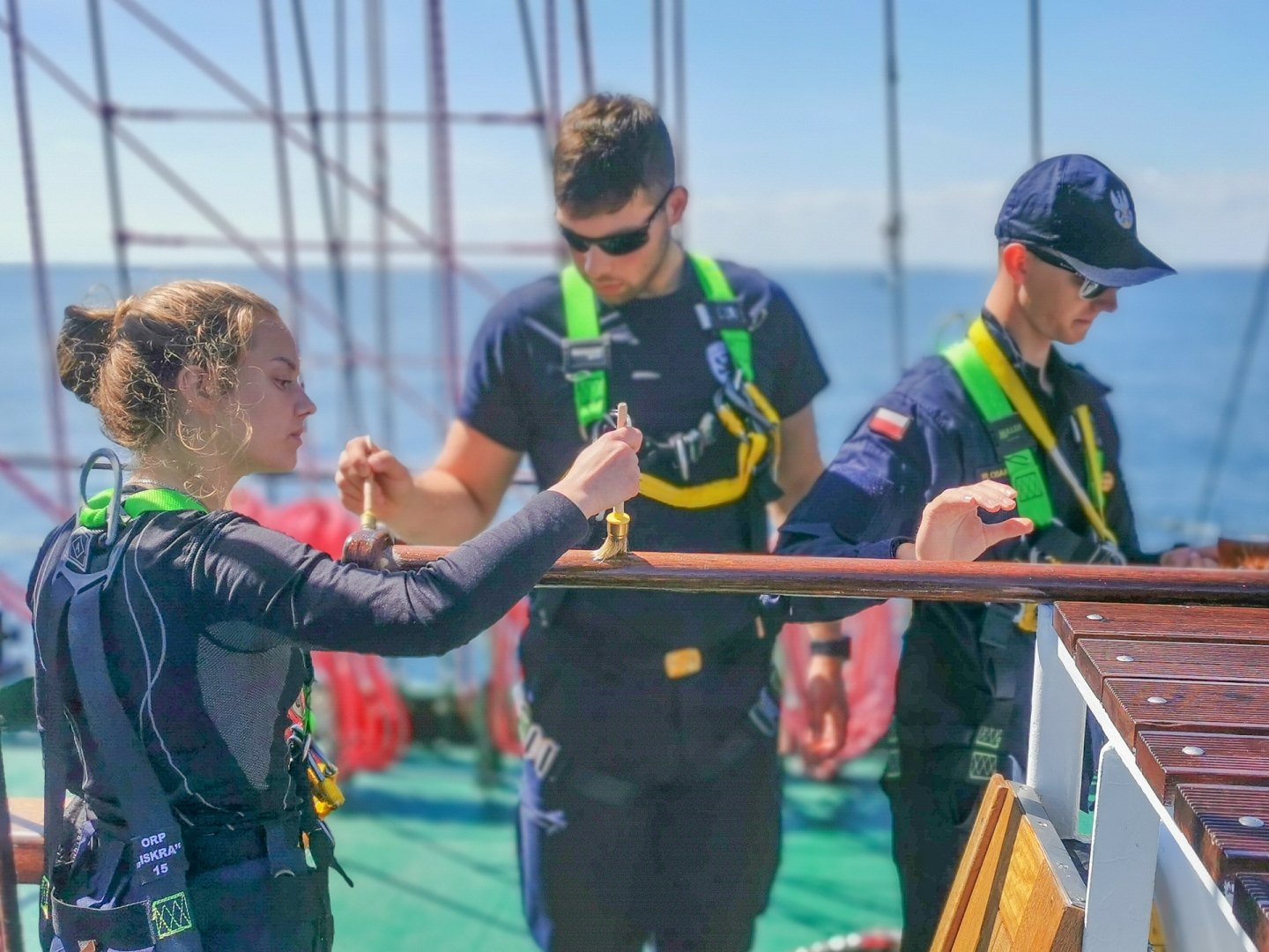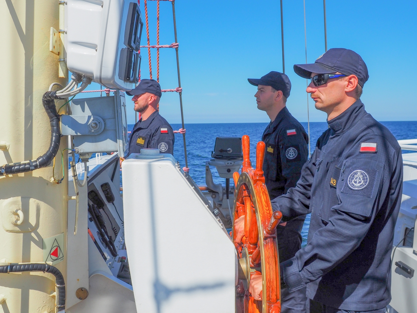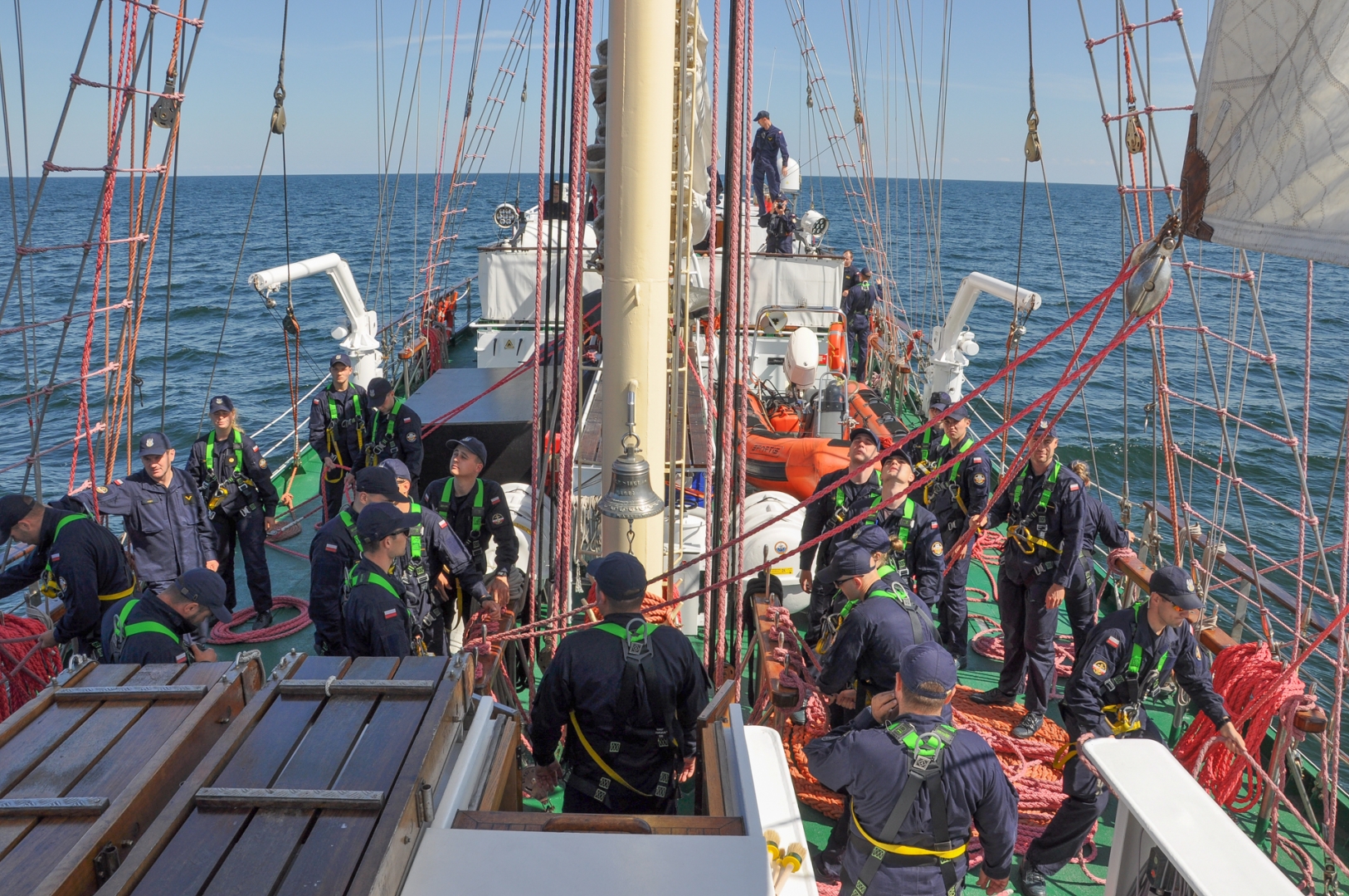 We wtorek, 21 lipca okręt wyszedł z Punktu Bazowania Hel w celu kontynuacji szkolenia na morzu. W związku ze szczególnie niekorzystną prognozą pogody dla rejonu Bałtyku Południowego dalsza część praktyki pod żaglami odbywała się na wodach Zatoki Puckiej. Okręt został przygotowany do warunków sztormowych, specjalne sztorm liny zostały zainstalowane na pokładzie tak aby praktykanci mieli możliwość ciągłej asekuracji. Na myśl przychodzi ulubione zdanie statkowych i okrętowych osób funkcyjnych „Safety first”. Doświadczeni marynarze mawiają, iż „sztormów się nie szuka, same nas znajdą”. Po dobie spędzonej na Zatoce Puckiej jednostka weszła na Bałtyk Południowy, gdzie morze przywitało młodych adeptów marynarskiego rzemiosła regularną „czwórką” (skala Pedersena stanu morza o wartościach w przedziale 0-9) i „siódemką” w skali Beauforta (siła wiatru w przedziale 0-12, „ósemka” oznacza sztorm i prędkość wiatru 33 węzły). Część z załogi złożyła tradycyjny „pokłon Neptunowi”, reszta z zadowoleniem przyjmowała dodatkowe racje żywności. Podchorążowie kontynuowali szkolenie i przerabiali kolejne zagadnienia dydaktyczne w tym m.in. węzły i sploty u bosmana okrętowego, a także znajomość poszczególnych alarmów okrętowych u zastępcy dowódcy okrętu. Wszyscy studenci zaliczyli wymagane partie materiału i zaczęły się przygotowania do egzaminu.