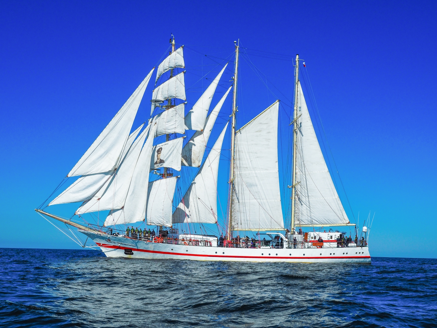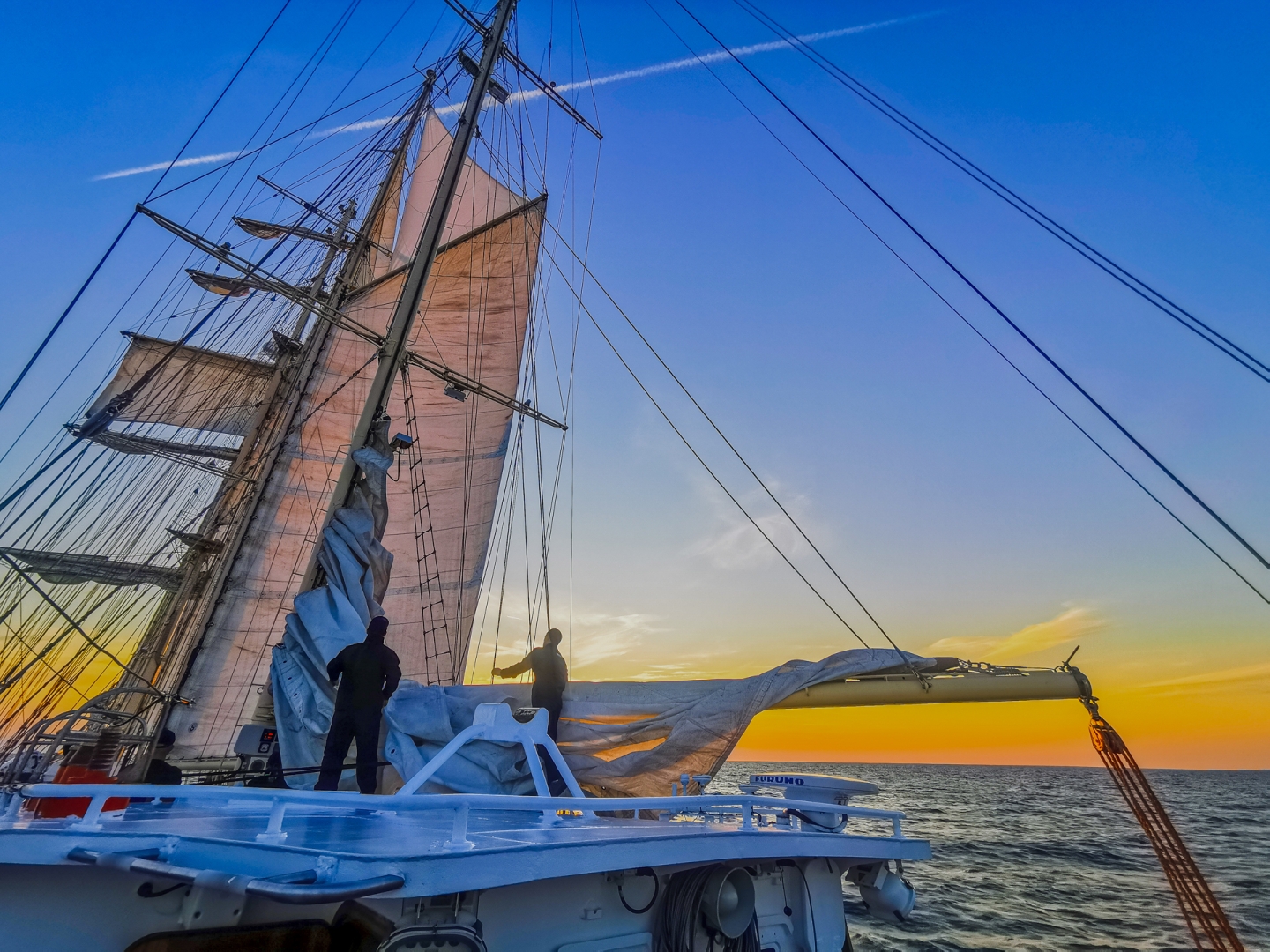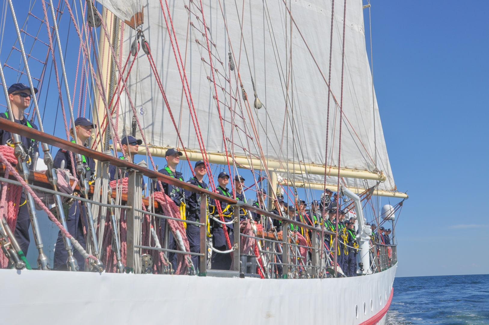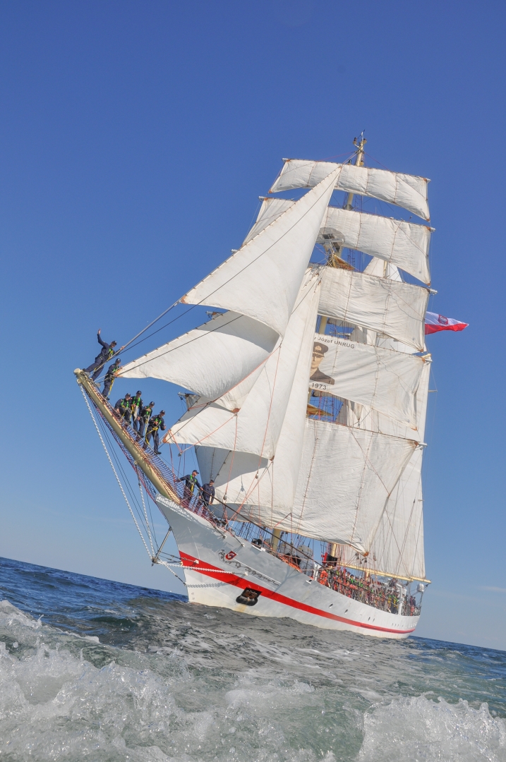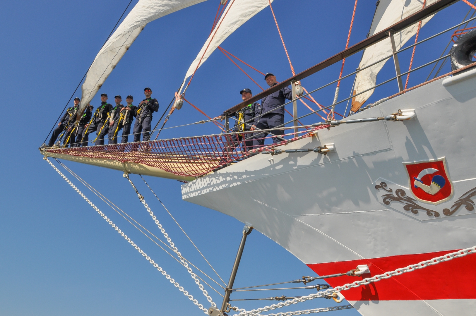 Po krótkim postoju w Porcie Wojennym Gdynia, w poniedziałek 13 lipca rano, „zagrano” alarm manewrowy. Obsady manewrowe na dziobie i rufie okrętu zajęły przynależne stanowiska. Do burty podszedł holownik, w asyście którego odcumowano z Basenu XI. Jeszcze w basenie portowym, dowódca fokmasztu wraz z obsadą postawili Dolnego i Górnego Marsla. Na Dolnym Marslu widnieje wizerunek admirała Józefa Unruga, legendarnego dowódcy polskiej Floty i Obrony Wybrzeża z 1939 roku, który przyczynił się do rozwoju szkolnictwa morskiego. Szkolnictwa, które przez wzgląd na charakter wykonywanych na morzu zadań, powinno wyróżniać się zawsze najwyższym poziomem kształcenia.