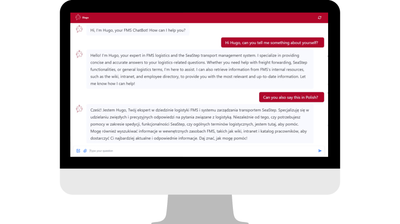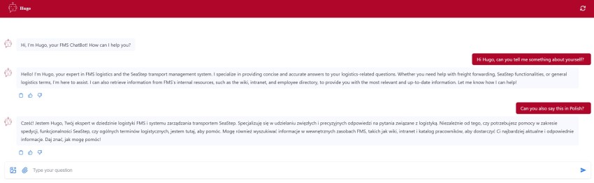 Hugo jest ekspertem w wykorzystaniu wszystkich możliwych systemów, procesów i narzędzi obowiązujących w codziennej pracy FMS Logistics. Asystent obejmuje praktycznie wszystkie obszary – od zarządzania transportem, przez operacje magazynowe, po analizę sprzedaży, księgowość i inne. Jednak samo posiadanie informacji to jedno, umiejętność przekazania ich w sposób przystępny i jasny to osobna kwestia. Hugo i z tym sobie radzi. Dzięki wykorzystaniu tzw. Forwarding Dictionary jest w stanie wyjaśnić wszystkie pojęcia i procesy w sposób umożliwiający łatwe ich zrozumienie.