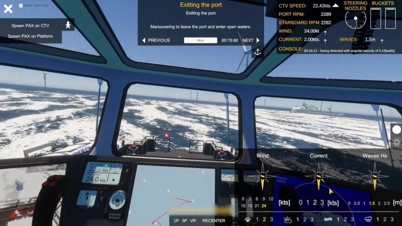Symulator to aplikacja jednostki CTV zintegrowana z istniejącą już platformą ruchu, składającą się z fotela sternika z pulpitem w futurystycznie zaprojektowanej obudowie. Powstałe w ten sposób narzędzie bazuje na realistycznej symulacji odzwierciedlającej fizyczne parametry zachowania statku oraz jego otoczenia. Oprogramowanie uwzględnia modyfikację czynników specyficznych dla środowiska morskiego, zwłaszcza zmiennych warunków atmosferycznych – wpływu falowania, prądów wodnych, wiatru, mgły, opadów itp. To zatem kompletny system umożliwiający profesjonalne przygotowanie załóg serwisujących maszty i turbiny wiatrowe na morzu.
