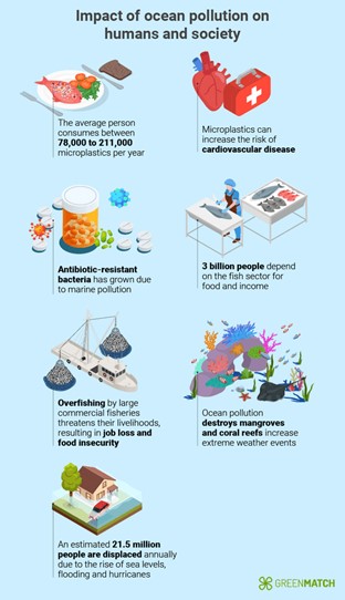 UNESCO podaje, że do 2050 roku plastik będzie przeważał nad wszystkimi rybami w morzu. Szacuje się, że 92% plastiku w oceanie to mikroplastik (plastik mniejszy niż 5 mm). Najczęściej spotykane plastiki w oceanie to niedopałki papierosów, opakowania po żywności, plastikowe butelki i nakrętki, słomki, kubki, talerze i jednorazowe plastikowe torby. 60% ryb zawiera mikroplastik, a 1 na 3 ryby złowione w celu spożycia zawiera plastik.