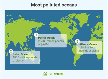 Z powodu zanieczyszczenia w oceanie znajduje się pięć głównych wysp śmieci składających się z unoszących się śmieci i innych zanieczyszczeń. Słynna Wielka Pacyficzna Wyspa Śmieci według szacunków zajmuje powierzchnię 1,6 miliona kilometrów kwadratowych, co czyni ją dwa razy większą od Teksasu.