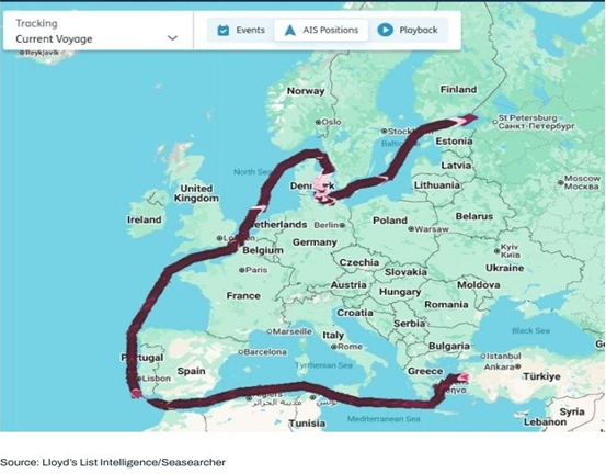 Trasa statku-zombie na Bałtyku, Atlantyku i Morzu Śródziemnym. Źródło: SynMax. Lloyd’s List.