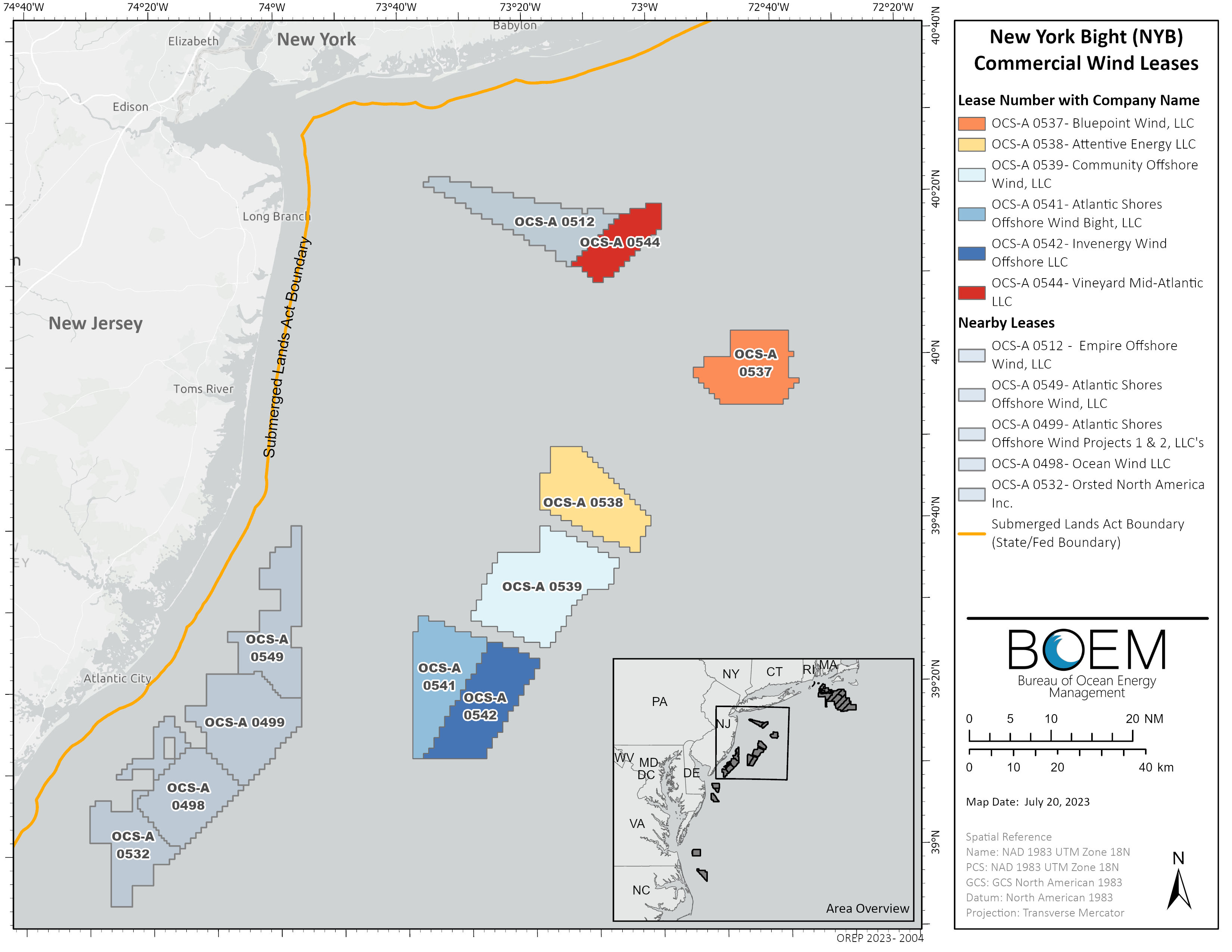 Po raz pierwszy BOEM przeprowadził regionalną analizę rozwoju i operacji morskich w zakresie odnawialnych źródeł energii w wielu obszarach najmu. BOEM postanowił podjąć ten dodatkowy krok, aby ukończyć Programowe Oświadczenie o Oddziaływaniu na Środowisko (Programmatic Environmental Impact Statement, PEIS) ze względu na bliskość między sobą sześciu obszarów najmu i czas, w którym BOEM spodziewa się otrzymać przyszłe plany projektów do przeglądu. Projekt PEIS analizuje przy tym środki działania, których BOEM może wymagać jako warunków zatwierdzenia dla wszelkich proponowanych projektów morskich farm wiatrowych na obszarze New York Bight.