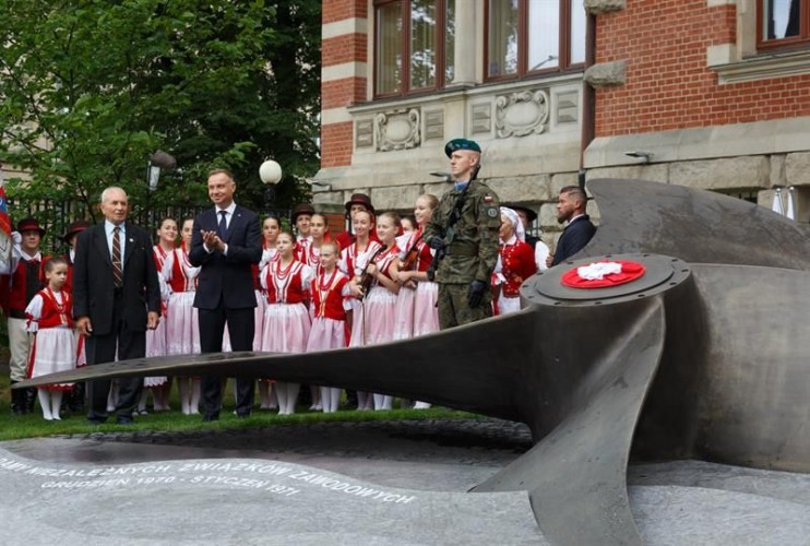 Prezydent Andrzej Duda wziął udział w uroczystości odsłonięcia pomnika Bohaterów Stycznia'71, który stanął przy Zachodniopomorskim Urzędzie Wojewódzkim w Szczecinie. Środowa uroczystość była częścią obchodów 43. rocznicy podpisania Porozumień Sierpniowych.