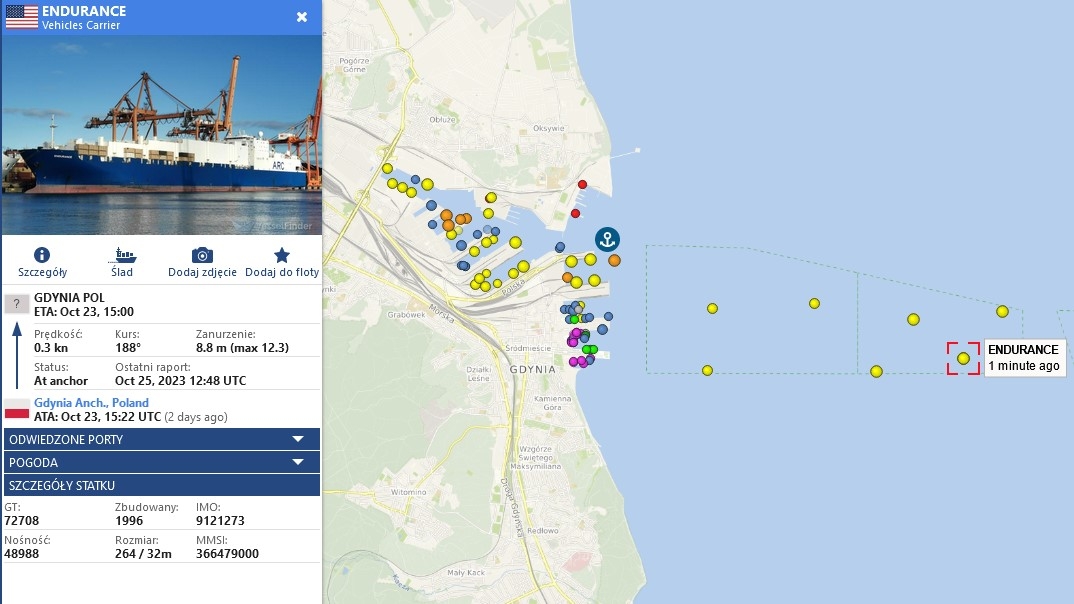 Jak można zauważyć na stronach pokazujących ruch jednostek nawodnych, na kotwicy stoi, czekając na możliwość wejścia do portu, kolejny samochodowiec pod amerykańską banderą, ARC Endurance. Oznacza to dalsze przeładunki wojskowego wyposażenia, prowadzone w Porcie Gdynia.