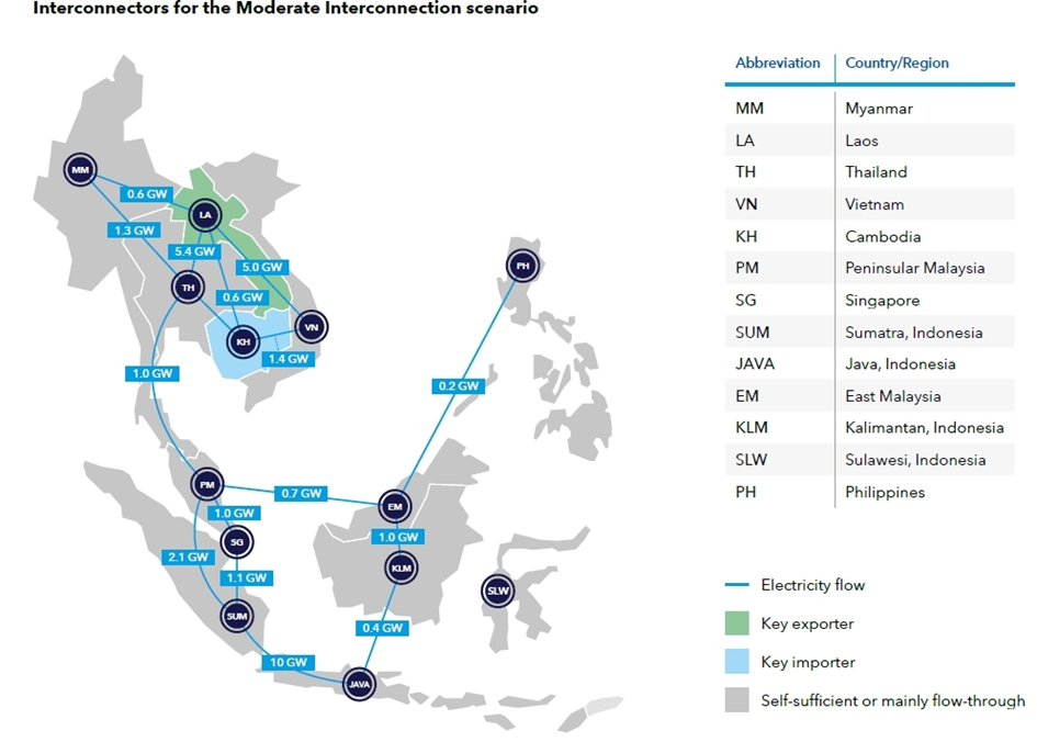 Współpraca regionalna oparta na połączeniach transgranicznych przyniesie korzyści ekonomiczne dla regionu poprzez zmniejszenie ogólnych wymagań dotyczących zasobów i powierzchni przestrzennej – podkreśla DNV w „ASEAN Interconnector Study” i pokazuje na mapie, że „współpraca regionalna z pełnym współdzieleniem zasobów za pośrednictwem interkonektorów transgranicznych spowoduje znaczące zmiany w krajobrazie energetycznym ASEAN”. Duże przepustowości interkonektorów umożliwiają transport znacznych ilości energii z krajów o wysokim potencjale odnawialnym do krajów o mniejszym poziomie produkcji lub zasobach niższej jakości.