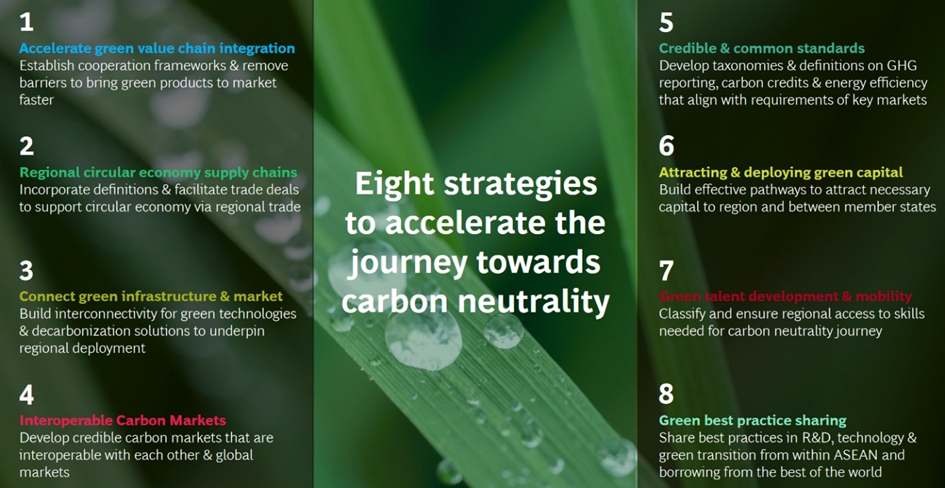 Ministrowie gospodarki ASEAN podkreślają, że „Strategia ASEAN na rzecz neutralności węglowej ma na celu wykorzystanie tych synergii, zobowiązując się do rozwijania zielonych gałęzi przemysłu, zwiększania interoperacyjności ASEAN, osadzania globalnie wiarygodnych standardów i odblokowywania zielonych możliwości. Strategia zmniejszy emisje w sektorach energetycznym, procesów przemysłowych i rolnictwa i innych”.