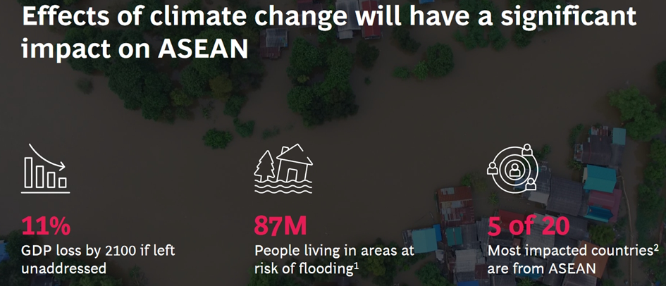 Rządy krajów ASEAN mają świadomość, że kraje regionu są szczególnie narażone na niekorzystne zmiany klimatu. Aż pięć z 20 najbardziej zagrożonych zmianami klimatycznymi krajów świata znajduje się w regionie. Wyliczono nawet, że „niekontrolowane zmiany klimatu mogą obniżyć regionalny PKB o 11% do 2100 r. i doprowadzić do przesiedlenia 87 milionów ludzi na obszarach wysokiego ryzyka powodzi w Indonezji, Malezji, Mjanmie, Tajlandii i Wietnamie”.