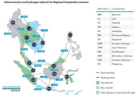 Kraje o zróżnicowanych zasobach energii słonecznej, wiatrowej i wodnej, takie jak Tajlandia i Laotańska Republika Ludowo-Demokratyczna, będą motorami napędowymi transformacji jako eksporterzy czystej energii na dużą skalę. Energia i wodór zaczną płynąć z północy na południe i z zachodu na wschód do krajów o mniej zróżnicowanych zasobach lub gorszej jakości. Wyniki badań przeprowadzone przez DNV i firmy współpracujące sugerują, że transformacja energetyczna z regionalną eksploatacją z paliw kopalnych na odnawialne źródła energii w regionie może zmniejszyć wymaganą całkowitą zainstalowaną moc generowania energii słonecznej nawet o 600 GW (20%) do 2050 r. w porównaniu z indywidualnym podejściem, w którym każdy kraj nie bierze pod uwagę połączeń regionalnych.