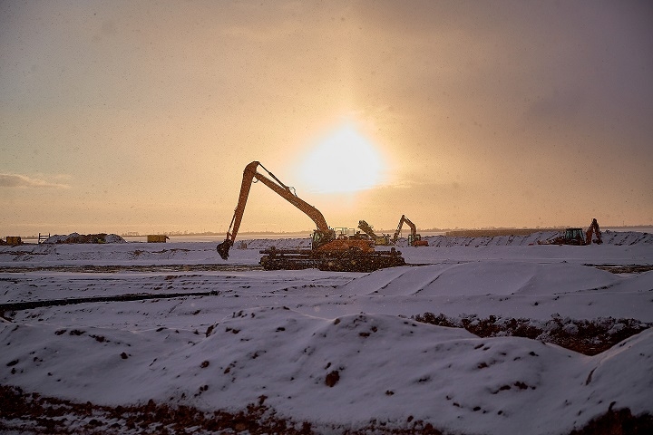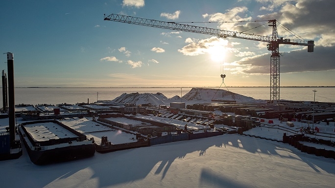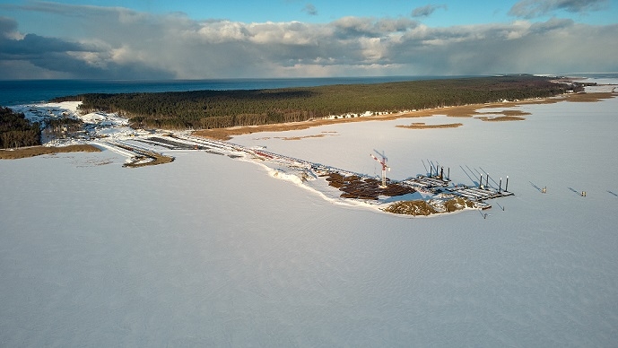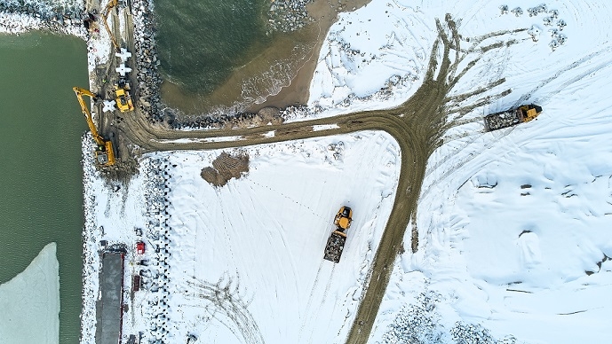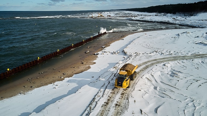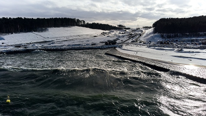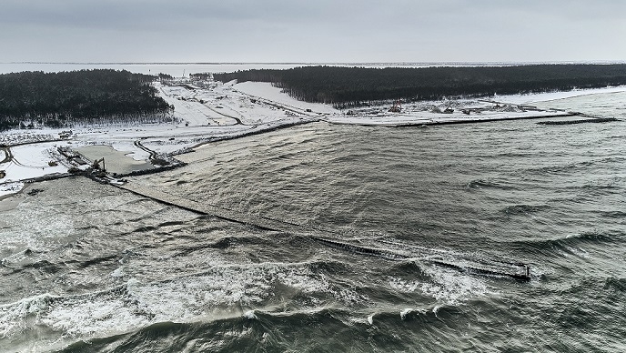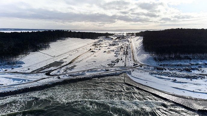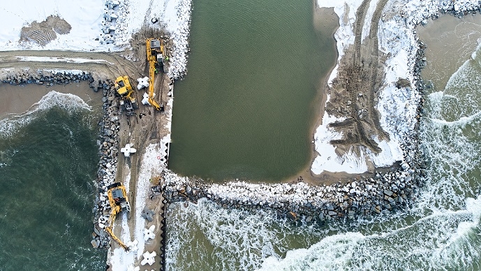 Mimo silnych mrozów i mocnych opadów śniegu intensywność robót na budowie przekopu Mierzei Wiślanej nie maleje. Trwają prace narzutowe w części morskiej. Zakończono wykonywanie ścianki szczelnej, mikropali i wykopów pod pale CFA w śluzie Kanału Żeglugowego. Montowana jest konstrukcja stalowa obu mostów. Harmonogram robót uległ modyfikacji jedynie na sztucznej wyspie, ponieważ Zalew Wiślany zamarzł. Nie zagraża to jednak planowanemu ukończeniu prac.