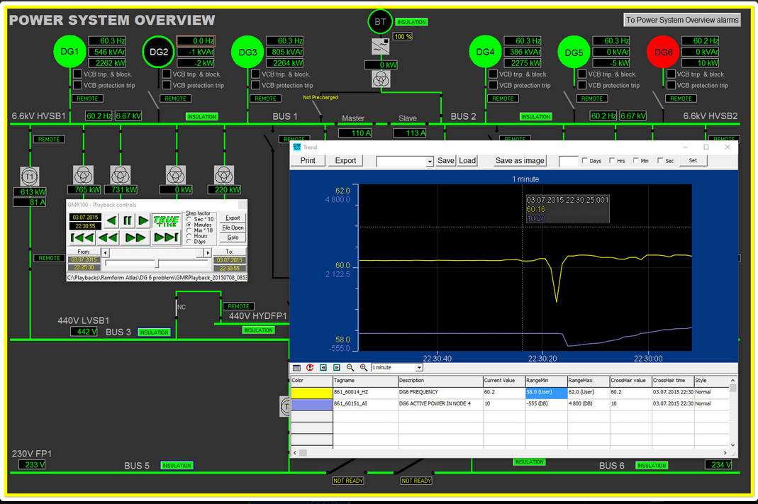 IAS pozwala załodze również na analizę przeszłych zdarzeń. Operator może sprawdzić dane historyczne z incydentu, takiego jak przerwa w dostawie prądu, i dokładnie zobaczyć przebieg zakłóceń.