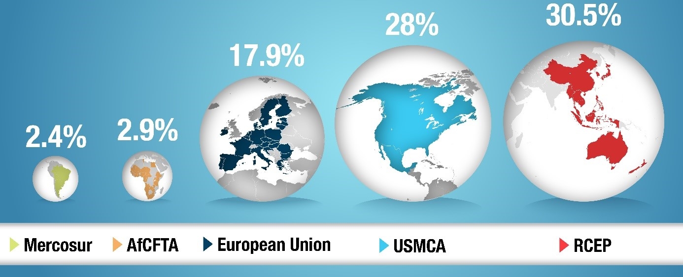 Spojrzenie na mapę świata i porównanie regionalnych potencjałów w tworzeniu produktu brutto daje jednak wiele do myślenia. Dla porównania, inne ważne regionalne umowy handlowe według udziału w światowym PKB to południowoamerykański blok handlowy Mercosur (2,4%), kontynentalna strefa wolnego handlu Afryki (2,9%), Unia Europejska (17,9%) oraz Stany Zjednoczone-Meksyk-Kanada. zgoda (28%).