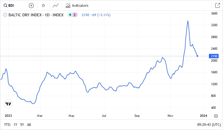 Główny indeks giełdy Baltic Exchange, który mierzy koszty transportu towarów na całym świecie, spadł w środę szóstą sesję z rzędu, spadając o 3,1% do najniższego poziomu od niemal miesiąca, wynoszącego 2150 punktów. Spadek następuje po krótkim, nagłym skoku wartości na początku grudnia. Mimo tego oraz chwilowych spadków indeks notuje ciągły, średni wzrost wartości.