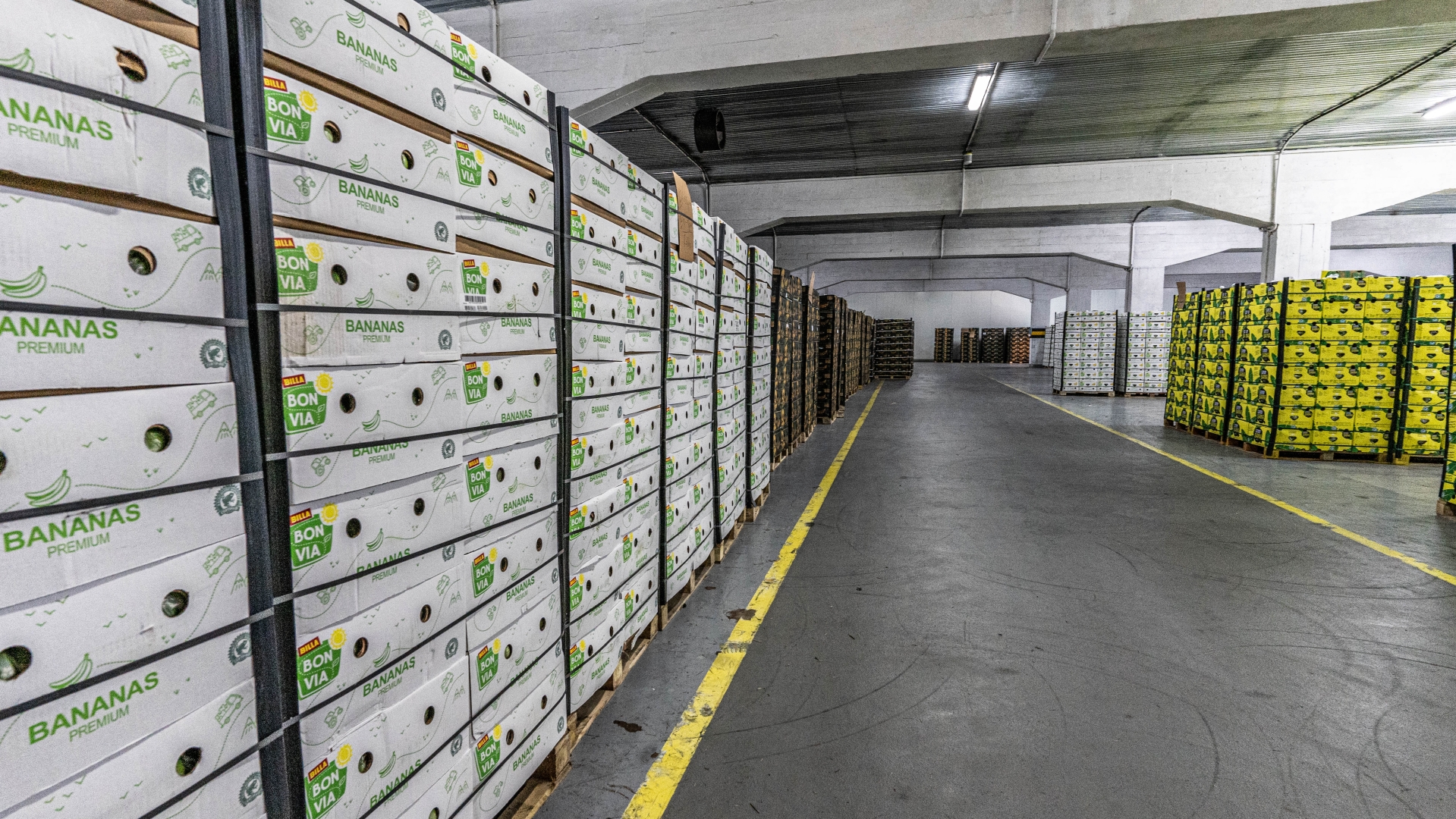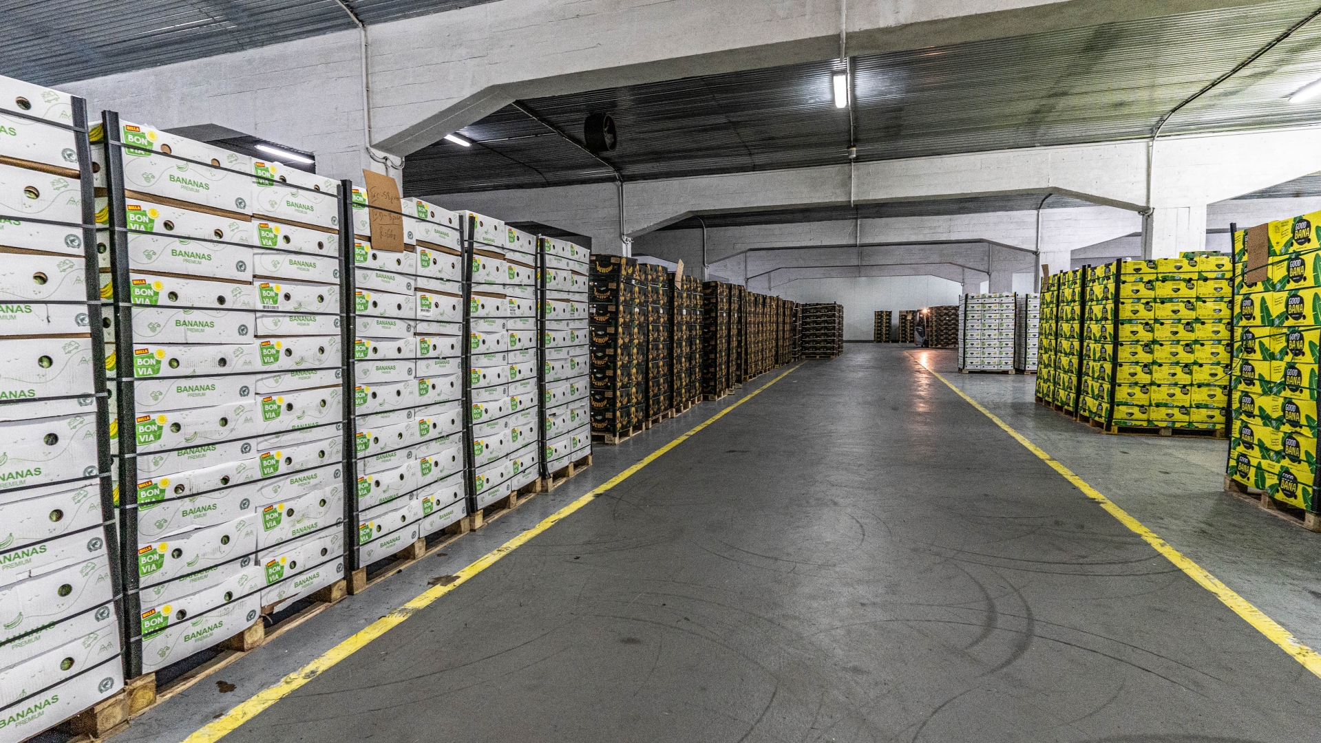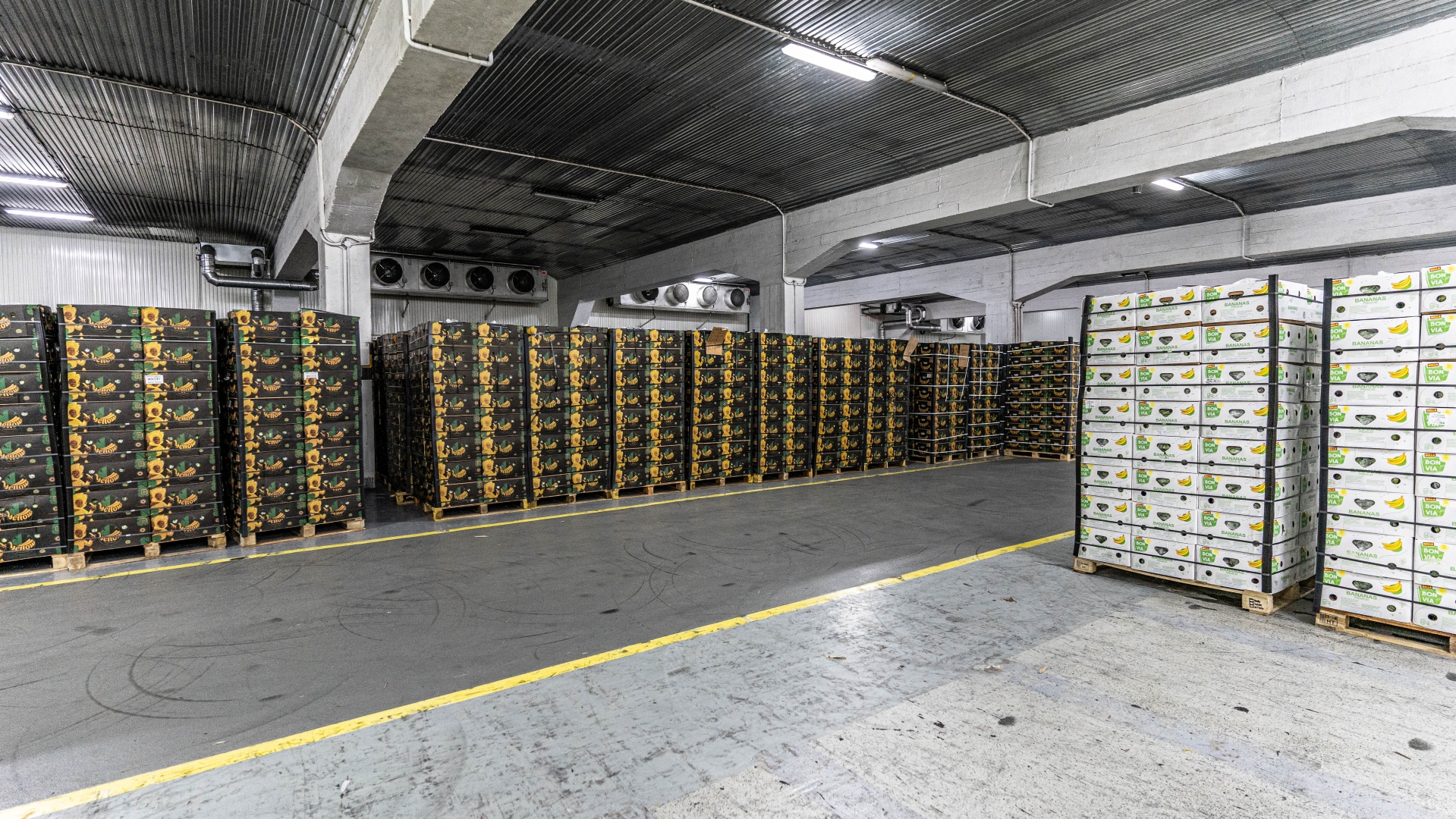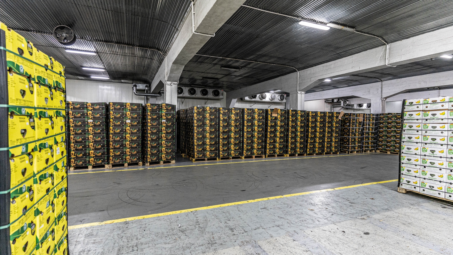 Owoce przypływają do portu w kartonach na paletach,następnie ładowane są do samochodów chłodni,kolejne etapy to proces dojrzewania w specjalistycznych komorach,oraz dostawa do klientów.