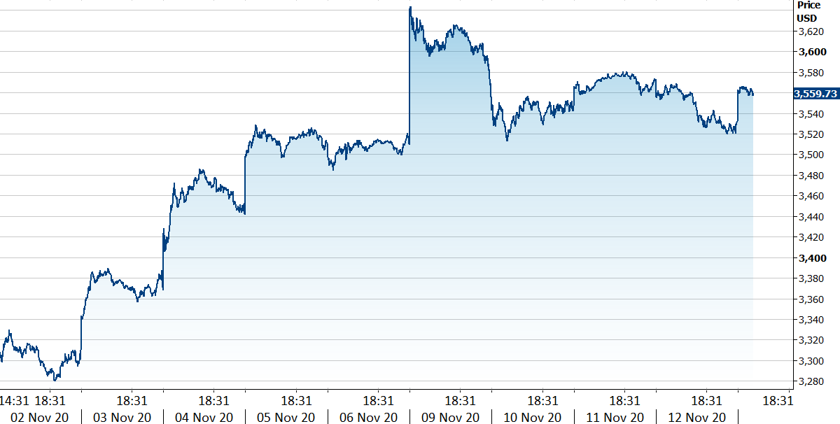 Waluty emerging markets (EM) umocniły się. Szczególnie silnych ruchów doświadczyły meksykańskie peso i chiński juan – waluty dwóch krajów uznawanych za najbardziej narażone na skutki kontynuacji protekcjonistycznej polityki prezydenta Trumpa. Indeks MSCI dla walut EM (MSCI Emerging Markets Currency Index) obecnie znajduje się na poziomie o ok. 1,5% wyższym niż na początku miesiąca i jest w okolicy najwyższego poziomu od maja 2018 roku (Wykres 3). Waluty rynków wschodzących w poniedziałek zostały wsparte pozytywnymi informacjami dotyczącymi postępów w pracy nad szczepionką na COVID-19.