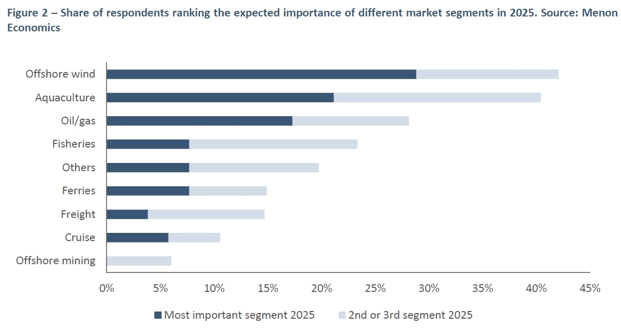 Menon Economis przeprowadził niedawno wśród członków klastra GCE Blue Maritime badanie opinii na temat biznesu morskiego w 2021 r. i jego przyszłości. Członkowie klastra z regionu Møre zapytani o uszeregowanie segmentów rynku według ich oczekiwanego znaczenia w 2025 r. postawili na rozwój morskiej energetyki wiatrowej.