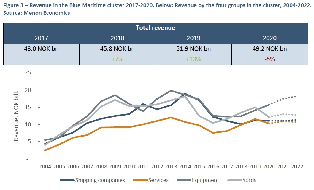 Przychody z działalności produkcyjnej i usługowej klastra działającego w regionie Møre spadły o 5% w porównaniu z 2019 r. Jednak nie wszystkie grupy klastra morskiego zanotowały spadek przychodów ze sprzedaży w 2020 r. Producenci wyposażenia okrętowego i sprzętu odnotowali wzrost przychodów aż o 11%, przekraczając tym samym, dynamiką przychodów stoczni. W wymiarze finansowym łączna sprzedaż tego klastra w 2020 r. osiągnęła 49,2 mld NOK.
