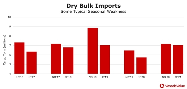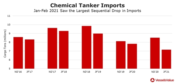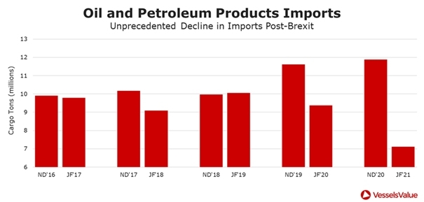 Biorąc pod uwagę wielkość importu w ciągu 2 miesięcy poprzedzających Brexit, obserwowano najwyższy poziom importu w najnowszej historii i 2% wyższy niż w 2019 r. – informują eksperci VesselsValue. Działo się tak pomimo słabszej gospodarki niż rok wcześniej. Po tym nastąpił natychmiastowy spadek importu o 40% w ciągu pierwszych 2 miesięcy po Brexicie. Obserwując zachowanie importerów ropy naftowej i produktów ropopochodnych pochodzenia brytyjskiego, dało się zauważyć znaczny wzrost zakupów bezpośrednio przed Brexitem (17% wyższy rok do roku), po którym następuje 25% spadek w styczniu i lutym br. W przypadku produktów chemicznych wahania nie były tak drastyczne jak w przypadku ropy i produktów ropopochodnych. Tu również stwierdzono zapobiegawcze zakupy zarówno przez importerów brytyjskich, jak i zagranicznych importerów brytyjskich produktów. Na przykład, podczas gdy brytyjski import był o 5% wyższy w listopadzie i grudniu niż w 2019 r., to spadł o 16% w styczniu i lutym.