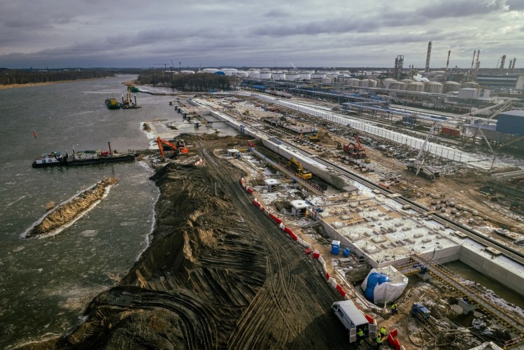 — Obecnie na terenie samego terminala wykonywane są prace podczyszczeniowe, zarówno na lądzie, jak i na części wodnej. Trwa montaż wyposażenia hydrotechnicznego: montowane są balustrady na pomostach komunikacyjnych. Dodatkowo na budynku BZT wykonywane są prace instalacyjne oraz murarskie. Rozpoczęliśmy też realizację przepustu w ramach przebudowy ulicy Sztutowskiej. Oprócz tego prowadzone są roboty na części rafineryjnej, między innymi prace fundamentowe, prace związane z montażem konstrukcji stalowych oraz prace związane z wykonywaniem elementów technologii między innymi montaż docelowych rurociągów technologicznych — mówi Maciej Klecha, Kierownik Budowy z Grupy NDI.