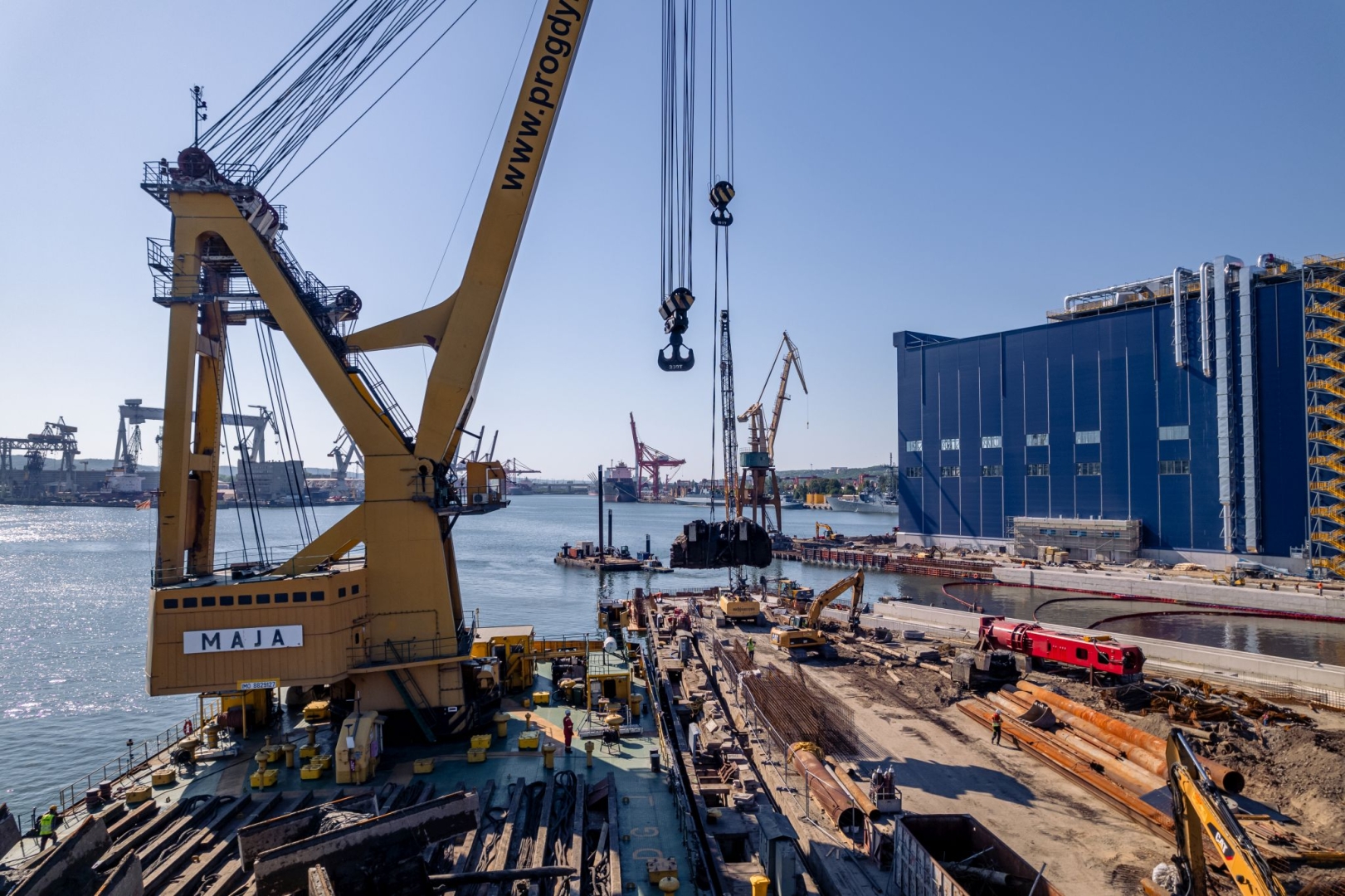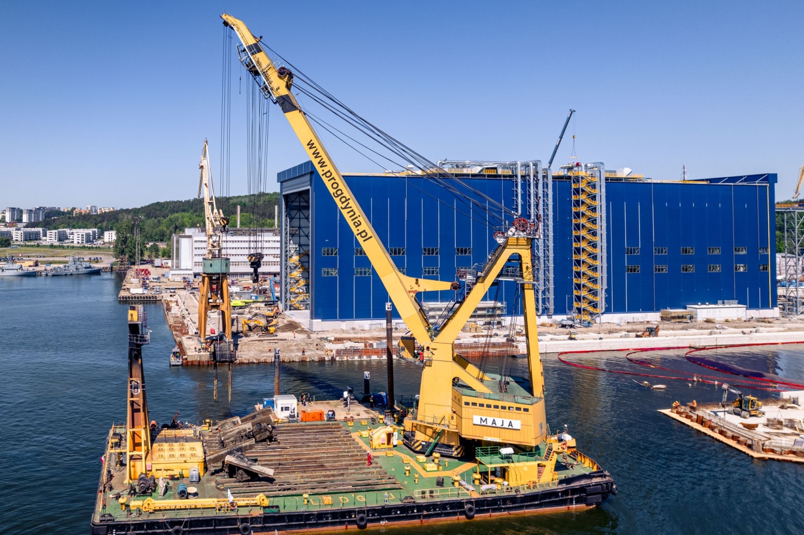 W Porcie Gdynia trwa realizacja nowej wnęki dla pływającego doku. Aby wykonać tę inwestycję, należało m.in. rozebrać i wydobyć spod wody stary slip. Trudnego zadania podjął się żuraw pływający Maja. Wcześniej wielką konstrukcję trzeba było odkopać i pociąć na kawałki. Co jeszcze dzieje się na budowie?