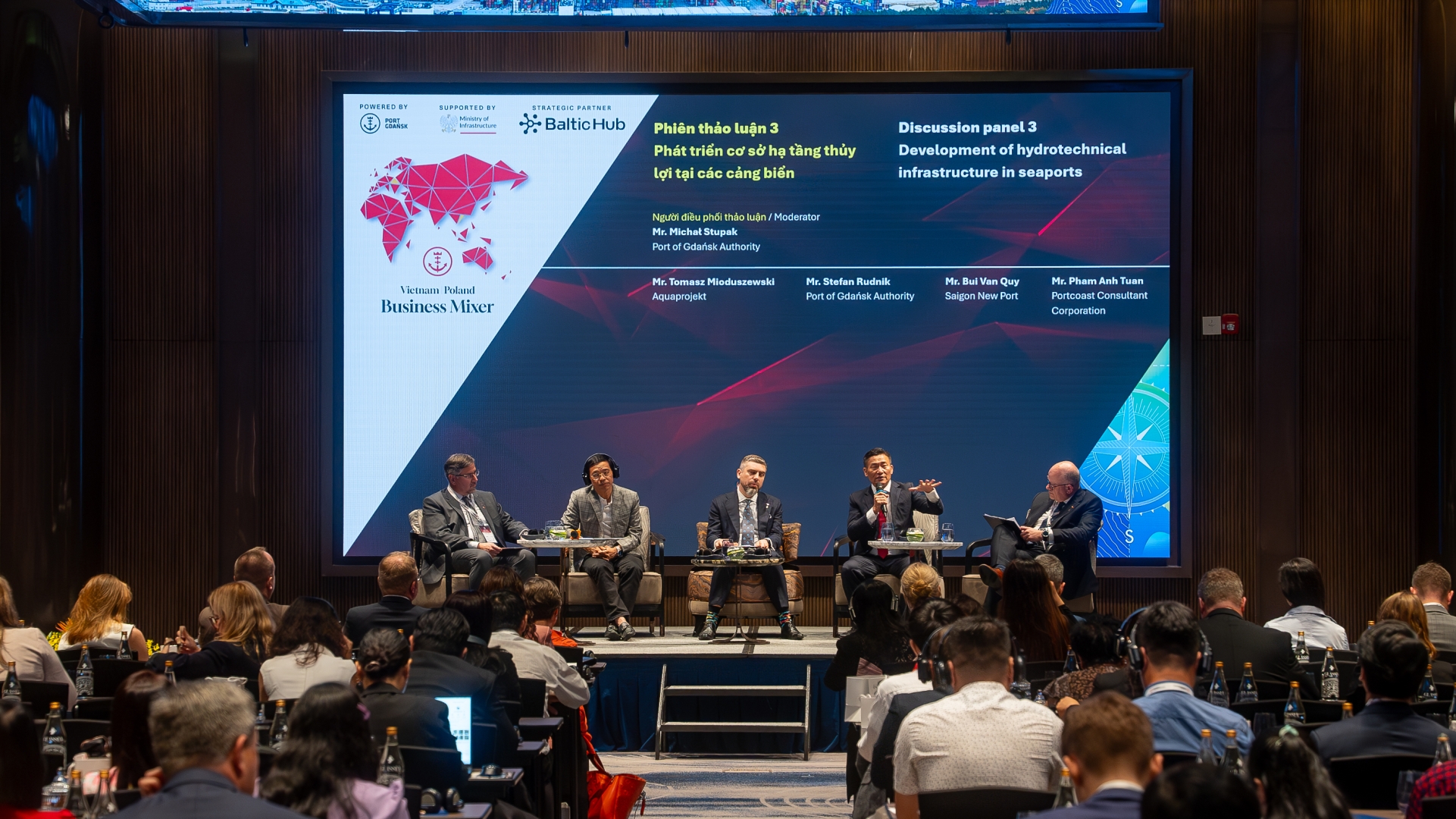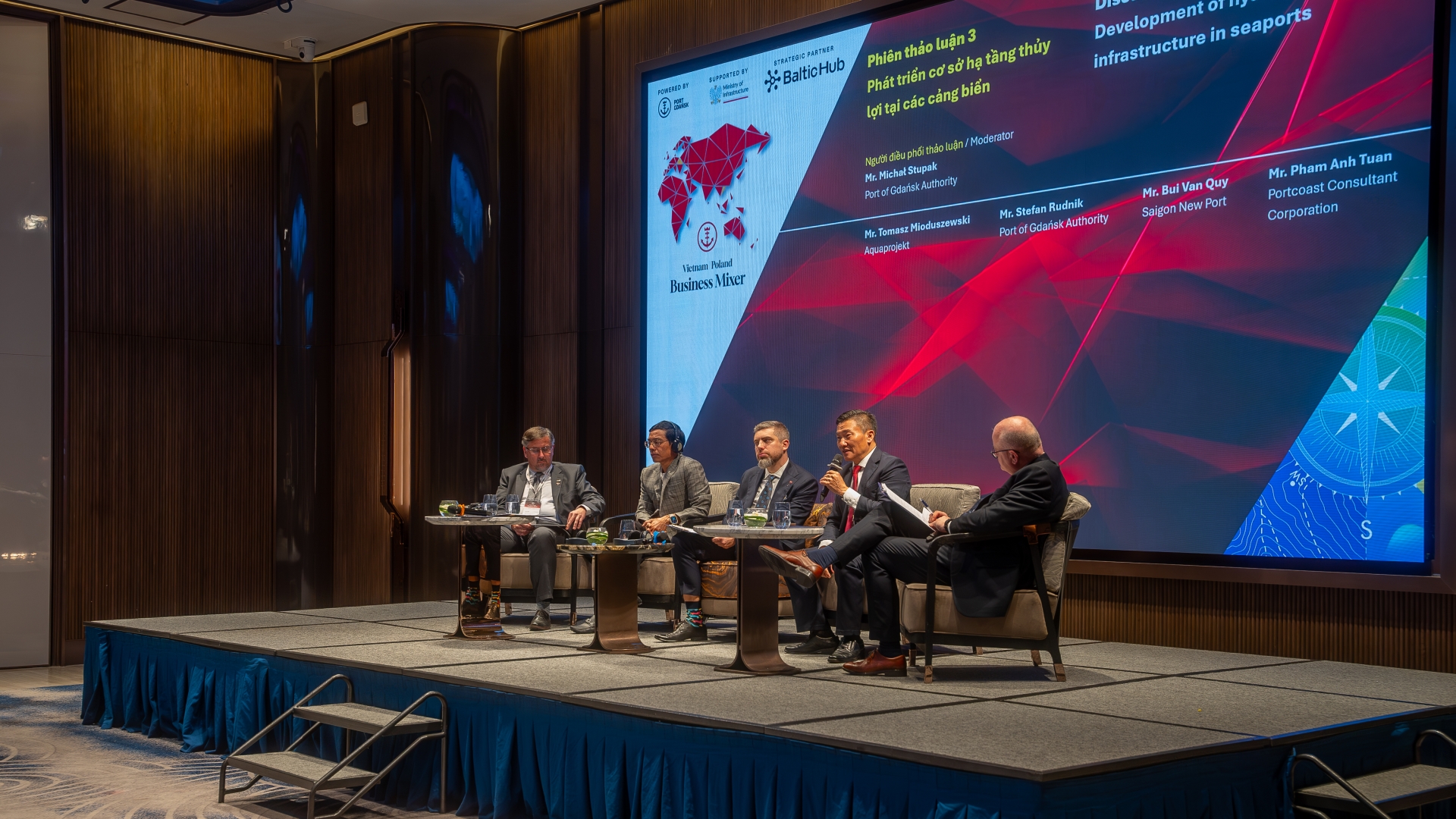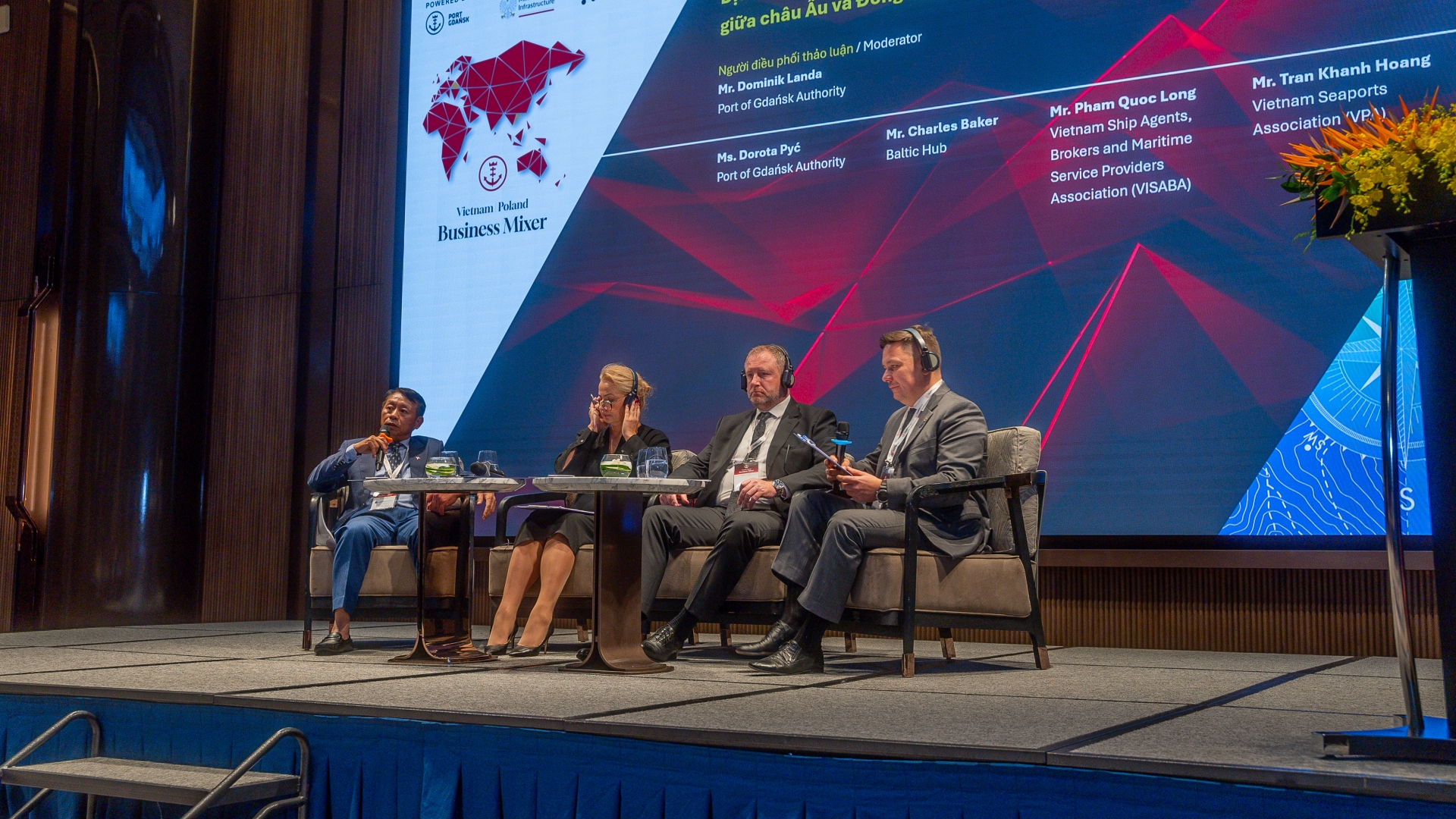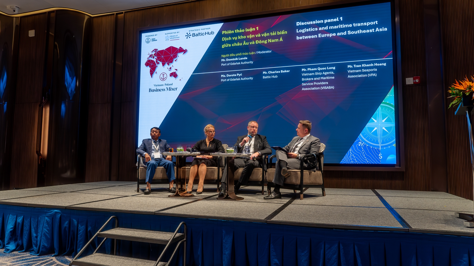 Po ogólnych przemówieniach przyszedł czas na dyskusje branżowe. Pierwszy panel dyskusyjny poprowadził Dominik Landa, dyrektor Pionu Strategii i Rozwoju Zarządu Morskiego Portu Gdańsk, który przywitał zgromadzonych po wietnamsku, co spotkało się z owacjami zebranych. To właśnie Landa w krótkim wstępie po raz pierwszy tego dnia wspomniał o nowym połączeniu, jakie od lutego zawijać będzie zarówno do Gdańska, jak i do Vung Tau w Wietnamie – obsługiwać je będą kontenerowce MSC w ramach serwisów Albatross i Britannia.