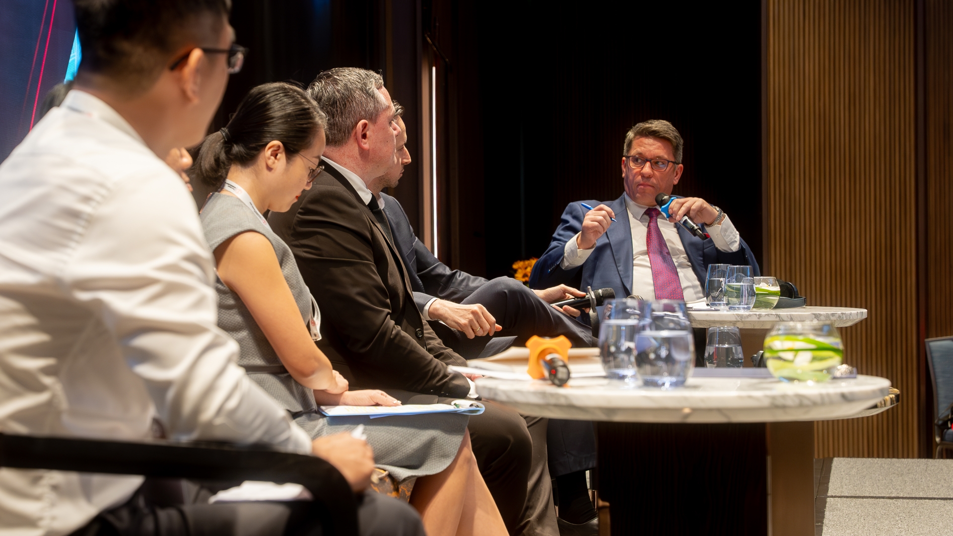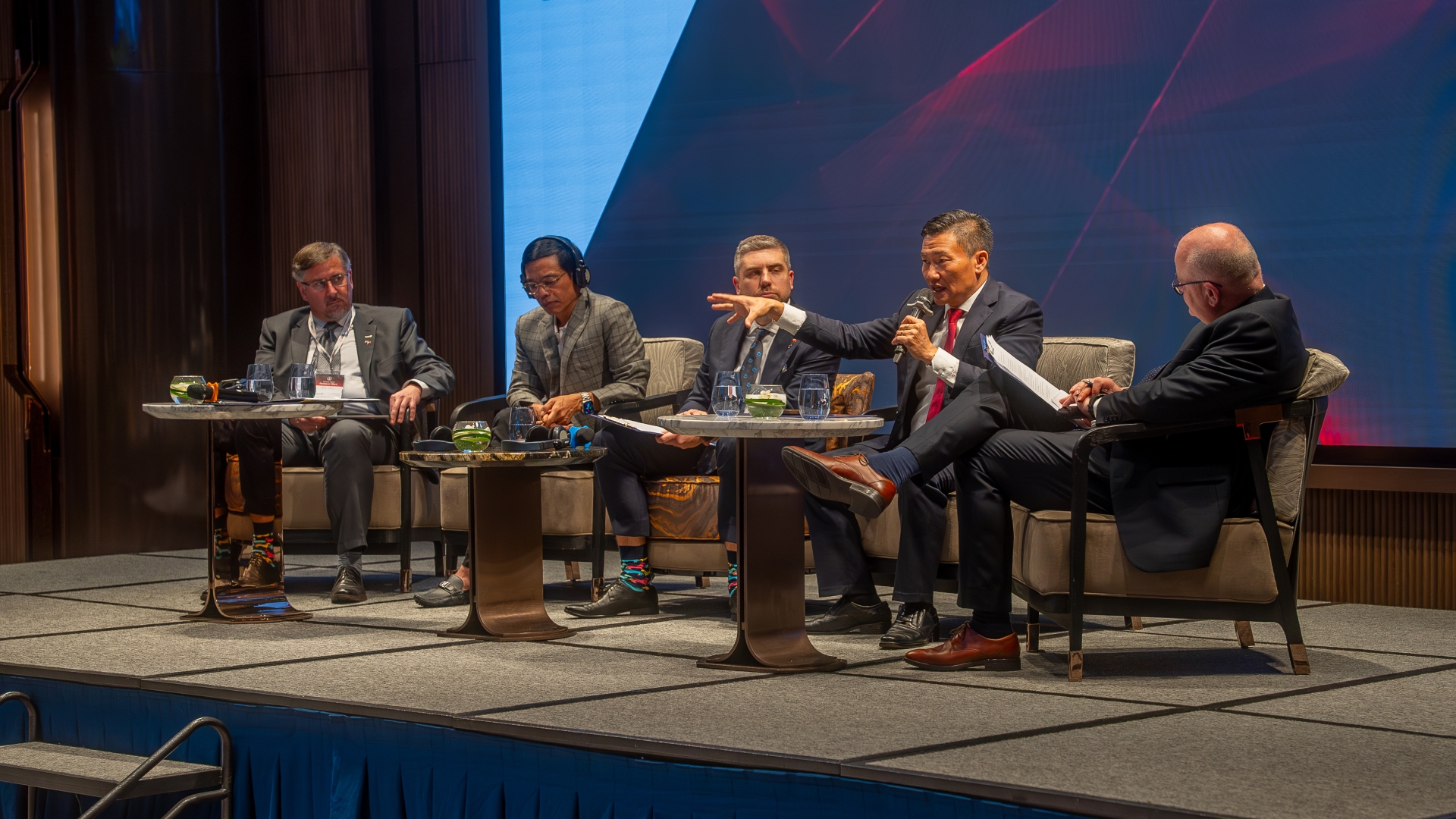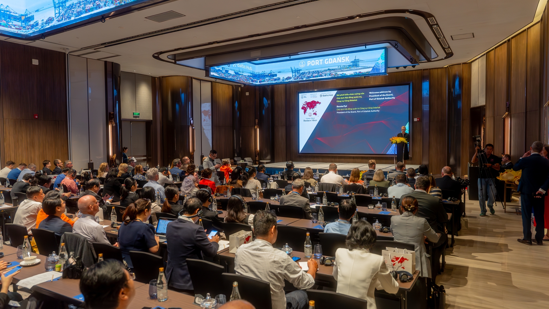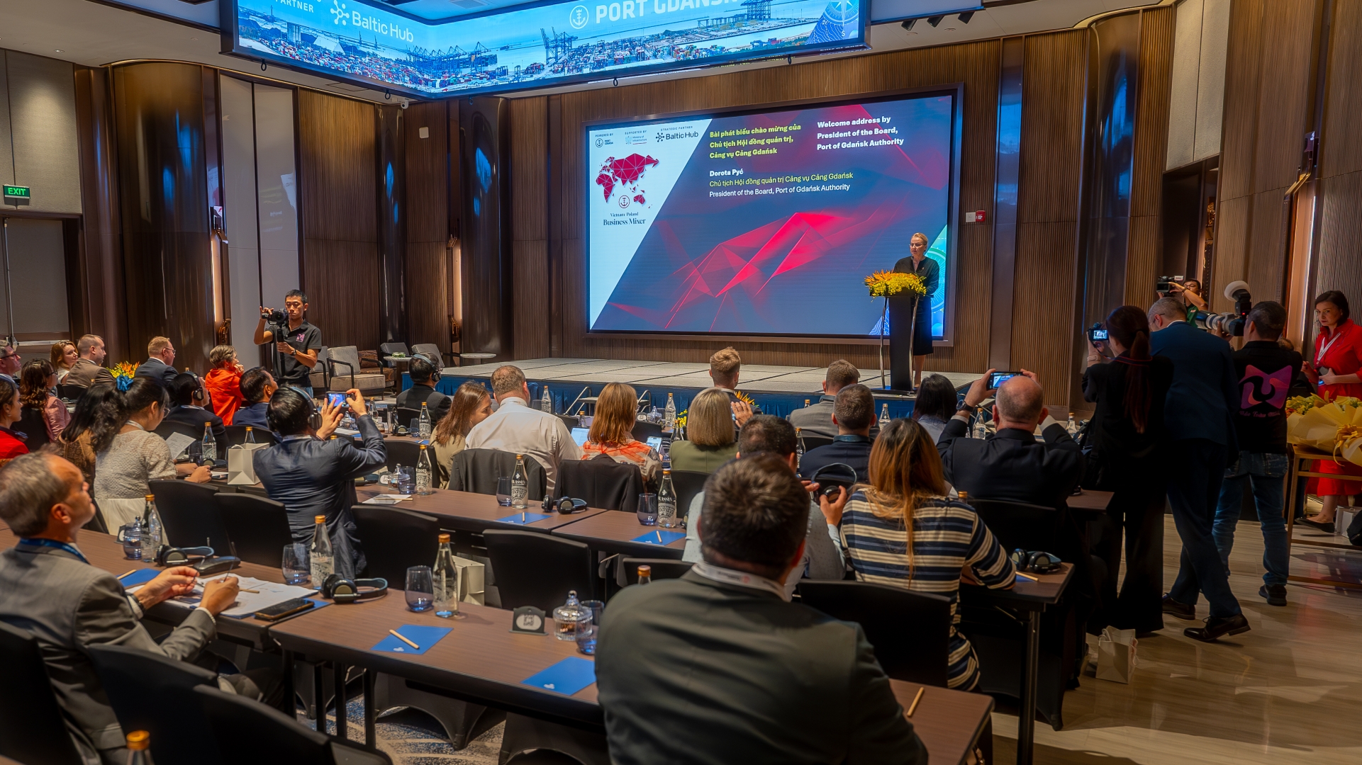 Po ogólnych przemówieniach przyszedł czas na dyskusje branżowe. Pierwszy panel dyskusyjny poprowadził Dominik Landa, dyrektor Pionu Strategii i Rozwoju Zarządu Morskiego Portu Gdańsk, który przywitał zgromadzonych po wietnamsku, co spotkało się z owacjami zebranych. To właśnie Landa w krótkim wstępie po raz pierwszy tego dnia wspomniał o nowym połączeniu, jakie od lutego zawijać będzie zarówno do Gdańska, jak i do Vung Tau w Wietnamie – obsługiwać je będą kontenerowce MSC w ramach serwisów Albatross i Britannia.