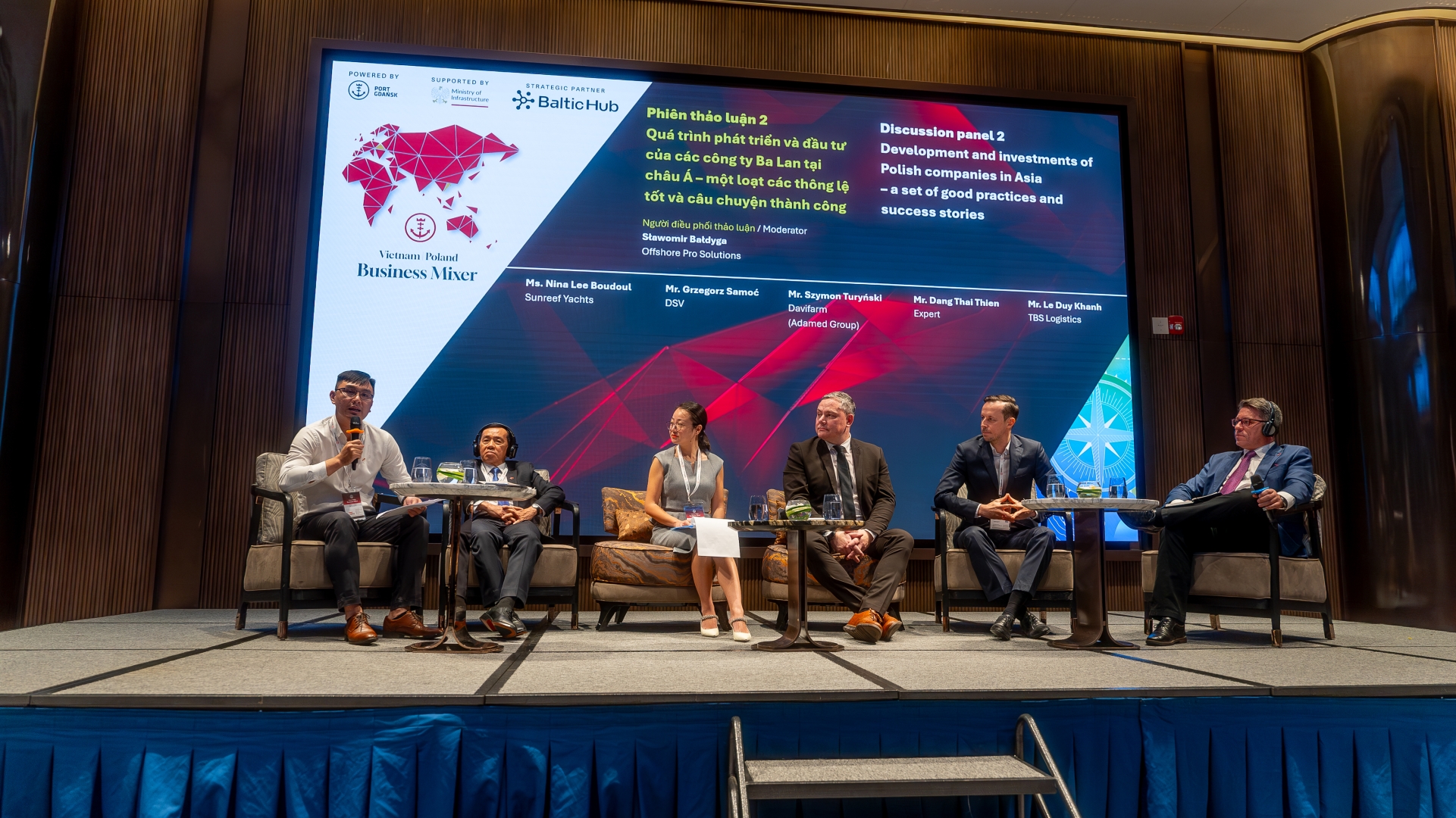 O dobrych praktykach i wpływie różnic kulturowych w prowadzeniu biznesu w Wietnamie przez polskie firmy ze swoimi gośćmi rozmawiał Sławomir Bałdyga. Wraz nim na scenie obecni byli Nina Lee Boudoul z firmy Sunreef Yachts, Grzegorz Samoć z DSV, Szymon Turyński z Davifarm (z grupy Adamed) Le Duy Khanh z TBS Logistics oraz ekspert rynkowy Dang Thai Thien. Nina Lee Boudoul opowiedziała o polskiej stoczni firmy, ale także o zadaniach, jakie wypełnia azjatyckie przedstawicielstwo marki. Tamtejsze biuro pomaga firmie w komunikacji z klientami z Azji, lokalnymi udziałowcami, ale też pozycjonuje Sunreef na tutejszym rynku. Jest też ważne w pozyskiwaniu wsparcia ze strony rządów i innych branżowych organizacji.