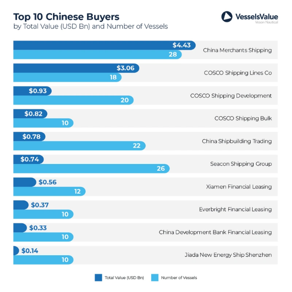 Na rynku zbiornikowców do przewozy ropy dominują armatorzy z Grecji, ale operatorzy z Chin ich gonią. Veson Nautical podsumował niedawno chiński portfel zamówień największych chińskich firm operujących statkami handlowymi oraz informacje na temat statków budowanych obecnie w chińskich stoczniach. Spośród największych chińskich firm zamawiających statki w zeszłym roku, China Merchants Shipping zajmuje pierwsze miejsce z kontraktami na 28 nowych statków o wartości 4,4 mld USD. Inwestycja ta dotyczy głównie sektorów tankowców i LNG, z których każdy odpowiadał za około 33%, ale obejmowała również nowe zamówienia na masowce i statki do przewozu pojazdów.