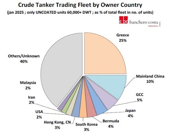 Banchero Costa Research podał w styczniu 2025 r., że flota zbiornikowców o nośności ponad 60 tys. t liczy obecnie 2194 jednostki, o łącznej nośności 442,14 mln t. Obecnie w eksploatacji znajduje się 884 jednostek VLCC, co stanowi 40% całkowitej liczby tego typu statków. Zbiornikowce Suezmax to w styczniu br. 596 jednostek, czyli 27% całkowitej liczby statków. Zbiornikowców Aframax było w styczniu 660 jednostek, czyli 30%. Liczba zbiornikowców Panamax oszacowano na 54 statki.