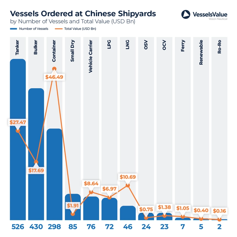 Chiński portfel zamówień na nowe statki przekroczył 123 mld USD już w 2024 r., z czego kontenerowce stanowią około 38% wszystkich nowych kontraktów na statki handlowe policzyli eksperci Veson Nautical opierając się na danych VesselsValue. W dokach chińskich stoczni wciąż jednak dominują zbiornikowce pod względem ilości wykonywanych jednostek. Pod względem wartości dominowały kontenerowce. Armatorzy UE również niemałą kwotą zasilają rozwój chińskiego przemysłu okrętowego. W stoczniach UE dominują statki pasażerskie i specjalistyczne.