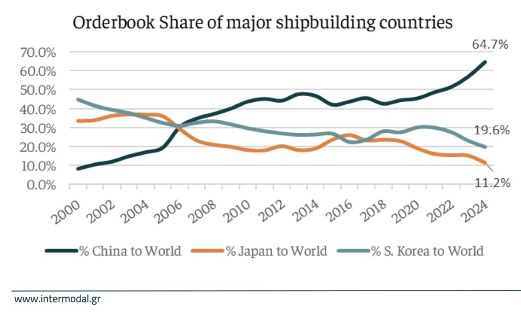 Chiny kontrolują obecnie 65% światowego portfela zamówień na budowę statków. Amerykański sektor budowy statków komercyjnych spadł do mniej niż pięciu statków rocznie, w porównaniu z 70 w 1975 r., podczas gdy Chiny budują obecnie 1 700 statków rocznie. Clarksons Research podaje, że „Globalna produkcja stoczniowa wzrosła o 13% w 2024 r., przy czym największy wzrost zanotowały Chiny (o 18% r/r) Zamówienia w stoczniach UE spadły i ich udział utrzymuje się na poziomie 4%. Chiny od kilku lat wyraźnie dominują w światowym budownictwie okrętowym. W ChRL działa siedem z 10 największych stoczni.