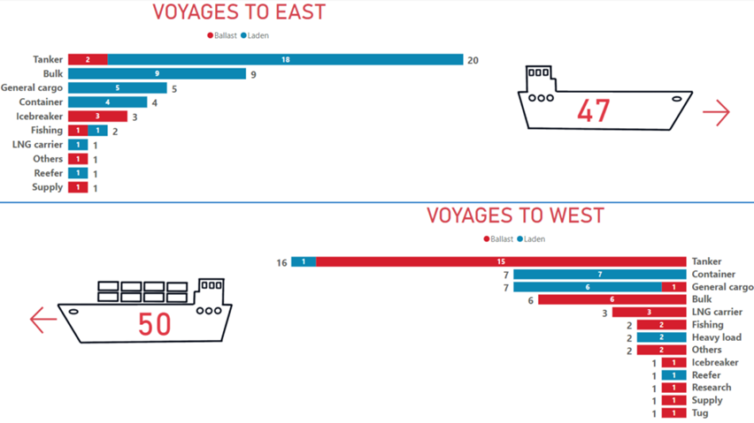 Dla porównania, w 2020 r. wzdłuż arktycznych granic Rosji, w tranzycie przewieziono statkami około 1,3 mln t towarów – podał w marcu 2021 r. Wiaczesław Ruksza, zastępca dyrektora ROSATOM i dyrektor Dyrekcji Północnej Drogi Morskiej (NSR) w ROSATOM. Statystycy NSR podają, że w 2019 r. w tranzycie przewieziono północnymi szlakami morskimi prawie 680 tys. t, a w 2020 r. już około 1,3 mln t towarów. W dobrym roku 2023 odbyto 79 rejsów i przewieziono około 2,1 mln t towarów. W najsłabszym okresie, w 2022 r. tranzytem przepuszczono jedynie 43 statki z około 0,1 mln t towarów.