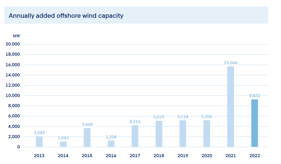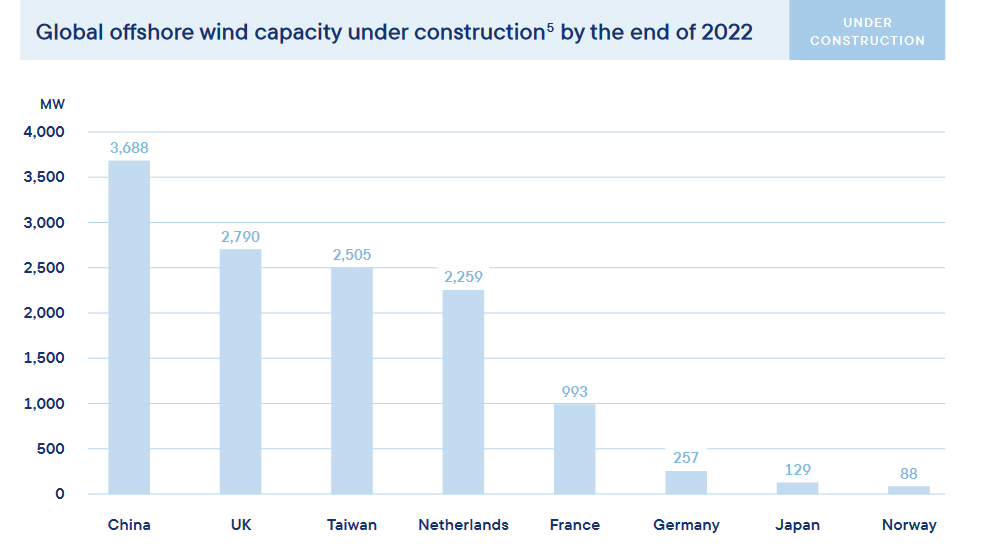 Globalny wzrost morskiej energetyki wiatrowej w 2022 roku był ponownie napędzany głównie przez Chiny, które zainstalowały 6,8 GW nowych mocy.