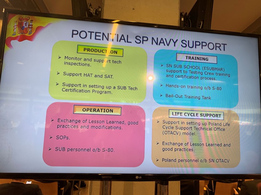 Kmdr Aguirre użył tu stwierdzenia, że w tym względzie Hiszpania może stać się „mentorem” w kwestii realizacji podobnego przedsięwzięcia. Tu należy dodać, że choć nie wybrzmiało to w prezentacji, budowa okrętów podwodnych dla marynarki wojennej była jednym z największych wyzwań hiszpańskiego przemysłu stoczniowego, natykając się na wiele problemów w trakcie kolejnych etapów powstania, jak choćby zbyt duży ciężar okrętu, co wymagało gruntownych poprawek, przy czym wsparcie mieli okazać amerykańscy specjaliści. Problemem był także czas budowy, gdyż prototypowa jednostka powstawała od 2005 roku, a zwodowano ją dopiero w 2021 (w międzyczasie wycofano ze służby trzy jednostki serii S-70). Budowa trzech kolejnych okrętów rozpoczęła się kolejno w 2007, 2009 i 2010 roku, przy czym jak dotąd żaden z nich nie został zwodowany. Pierwotnie miały przekazane do służby kolejno w 2024, 2026 i 2027 roku i aktualnie terminy te zostały przesunięte o kolejne dwa lata. Stąd istnieją poważne obawy co do ogólnej terminowości realizacji zlecenia, a także zakłócenia ciągłości szkolenia hiszpańskich kadr „podwodników”. Z jednej strony można więc spytać, na ile wykonawca, hiszpańska stocznia Navantia byłaby zdolna dostarczyć w atrakcyjnym terminie okręty dla zamawiającego zza granicy, z drugiej „zaletą” ma być uzyskane doświadczenia, które przy budowie kolejnych jednostek ma być wolne od błędów, jednocześnie dzieląc się doświadczeniem w zakresie utrzymania zdolności szkolenia kadr „podwodników”.