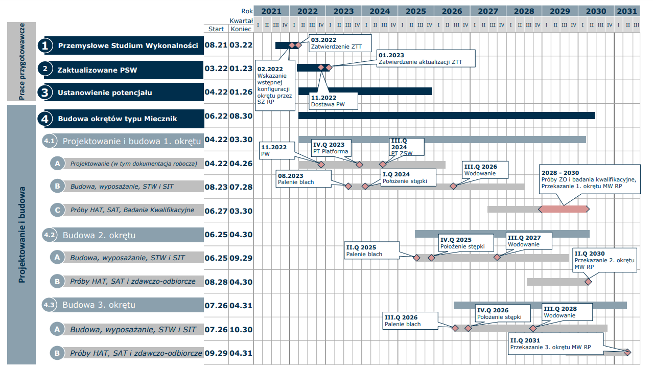 Podczas wydarzenia uczestnicy mieli okazję przypomnieć sobie aspekty całego przedsięwzięcia, zaprezentowane m.in. w trakcie VIII Forum Bezpieczeństwa Morskiego, które odbyło się 15 czerwca br. Dyrektor programu "Miecznik" Cezary Cierzan omówił długo oczekiwany harmonogram realizacji programu, który zakłada, że budowa pierwszego, prototypowego okrętu ma rozpocząć się 16 sierpnia br., podczas gdy położenie stępki jest zaplanowane na I kw. 2024 roku, a wodowanie kadłuba w 2026 roku. Przekazanie okrętu zamawiającemu i jego badania kwalifikacyjne mają zostać przeprowadzone w latach 2028-2030. Kolejno w 2025 i 2026 roku w PGZ Stocznia Wojenna ma odbyć się cięcie blach pod dwa seryjne okręty programu. Kolejne etapy budowy w ich przypadku to położenie stępki tak samo w 2025 i 2026 roku, wodowanie w 2027 i 2028 roku i przekazanie gotowych okrętów w 2030 i 2031 roku. Jednocześnie już na przyszły rok zaplanowano gotowość większości infrastruktury stoczniowej, w której okręty mają być budowane i doposażone.