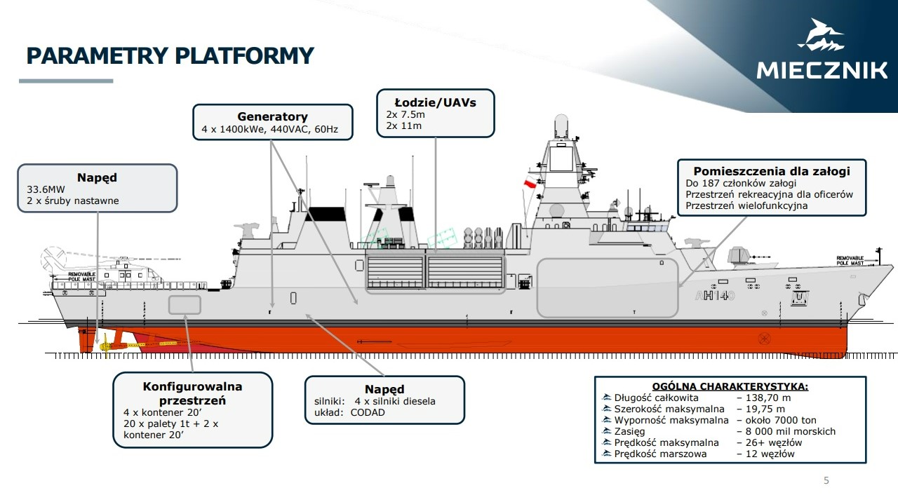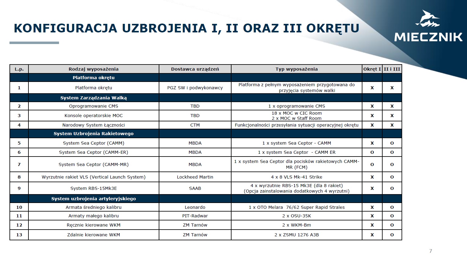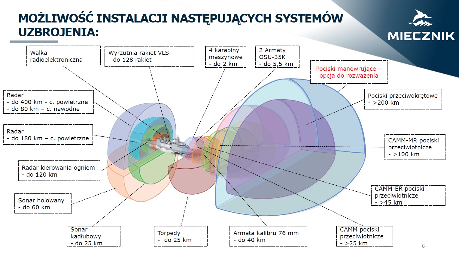 Przedstawiono także aktualny projekt okrętu z parametrami platformy, nie będący tylko wizualizacją. w tym konfigurację uzbrojenia oraz podstawowe zdolności operacyjne, wskazując zarówno zapewnione wyposażenie fregat, jak i pozostające w ramach opcji. Rozdzielono to na prototypowy oraz dwa seryjne okręty, wskazując tym samym na możliwe zmiany w programie, jeśli chodzi o doposażanie. Co budzi obawy i zastrzeżenia, dotyczy to tak dużej ilości wyposażenia i uzbrojenia, które jeszcze nie jest w przysłowiowy sposób "zaklepane" na pozostałe okręty. Z zakresie możliwości operacyjnych broń, jaka znajdzie się na okrętach ma zapewnić jednemu siłę całego dywizjonu, w dodatku posiadając możliwość działania przeciw każdemu zagrożeniu. Dotyczy to zwalczania okrętów podwodnych, celów powietrznych i innych okrętów. Biorąc pod uwagę zasięg radarów i wyrzutni rakiet oraz torped ma to zapewnić skuteczną obronę polskiego wybrzeża, interesów państwa na morzu i krytycznej infrastruktury morskiej dyrektor programu powtórzył tezę z VIII Forum Bezpieczeństwa Morskiego, że w swojej dotychczasowej historii Polska nie dysponowała dotąd tak silnym systemem walki jak w ramach "Miecznika".
