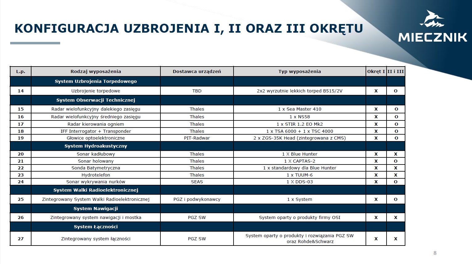 Dyrektor programu Miecznik wskazał również kluczowych partnerów przemysłowych realizujących przedsięwzięcie. Przypomniał również, że doszło do zmiany w składzie konsorcjum, o czym pisaliśmy w poświęconym temu artykule. Przypomnijmy po krótce, że gdańska stocznia Remontowa Shipbuilding S.A., która przez długi czas była jego członkiem, zmieniła status na partnera, a stosowna umowa w tym zakresie została podpisana 14 czerwca br. Obecnie więc w skład PGZ-Miecznik wchodzą PGZ S.A. oraz PGZ Stocznia Wojenna Sp. z .o.o. Partnerami zagranicznymi programu są bez zmian Babcock International (dostawca projektu platformy Arrowhead 140, na której jest oparte rozwiązanie projektowe polskich fregat) oraz Thales UK. Wśród innych, kluczowych partnerów są MBDA oraz Ośrodek Badawczo-Rozwojowy Centrum Techniki Morskiej S.A.