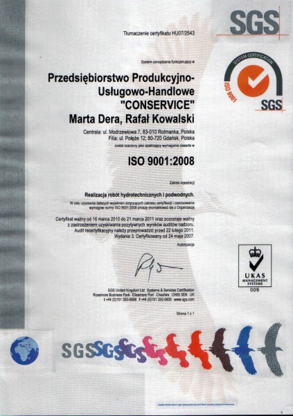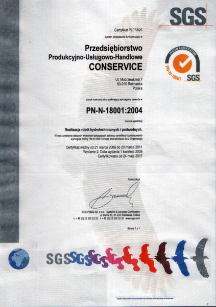 Firma \"CONSERVICE\" rozpoczęła działalność w 1983r. i po okresie transformacji gospodarczej w latach dziewięćdziesiątych działa do dzisiaj jako firma budownictwa hydrotechnicznego. Od grudnia 2003r. posiada Certyfikat ISO 9001-2000 w zakresie wykonawstwa w/w robót a od 2005-03-22 Certyfikat PN-N-18001:2004.