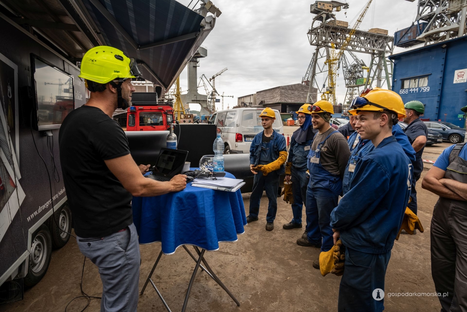 Strażacy mogli sprawdzić funkcjonalność długo wyczekiwanej nowości na rynku, kamery nahełmowej UCF FireCore z wizjerem montowanym wewnątrz maski. Jak zaznaczył Jakub Marer, prezes OSP CRIST, strażacy muszą nieustannie podnosić swoje kwalifikacje i stale być w gotowości do reakcji, choć, jak przyznaje, prewencja w stoczni stoi na wysokim poziomie.