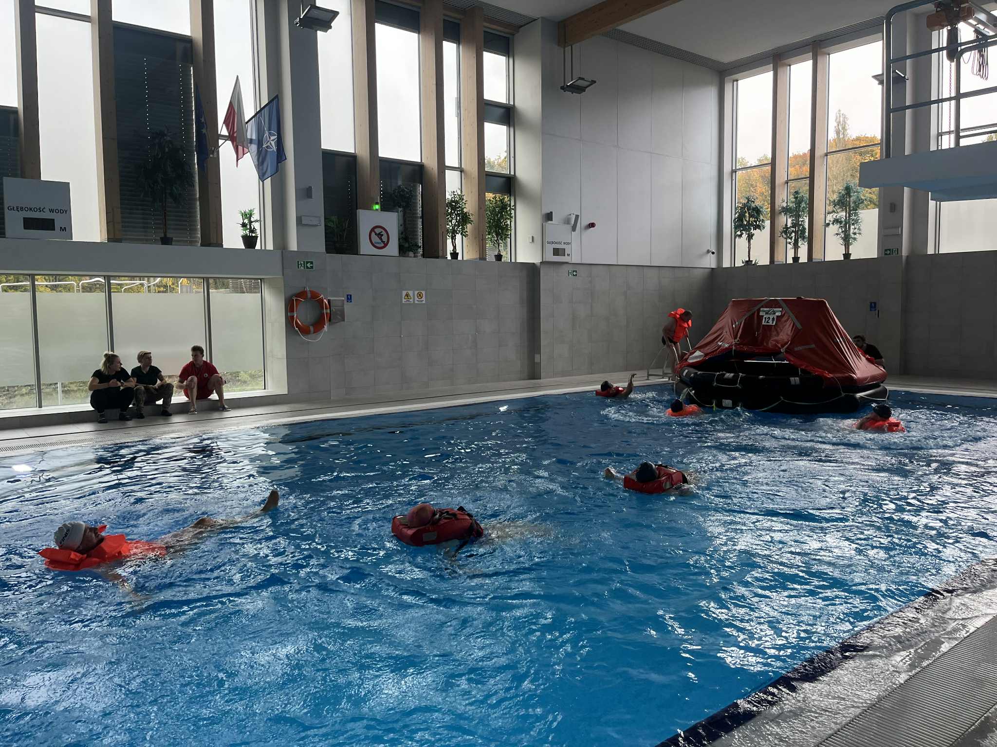 – Po tym po tym szkoleniu, będącym faktycznie fragmentem prawdziwego kursu, uczestnicy nabierają takiej wyobraźni przestrzennej, co może ich spotkać na wodze i jak powinni się zachować. Także mając możliwość spróbowania wejścia do tratwy ratunkowej, co także daje pole do wyobraźni, gdyż takowe, choć występują na statkach i okrętach, na jednostkach, pozostają na co dzień schowane. Zajęcia to też okazja zmierzenia się ze słabościami, lękiem wysokości, przed głęboką wodą. Osoby, które nie potrafią pływać, lepiej uważnie słuchają tego, co instruktorzy mają do powiedzenia i odpowiednio zachowują się w wodzie. Musimy mieć z tyłu głowy, że groźne sytuacje będą miały miejsce nie na basenie, tylko np. Morzu Bałtyckim, który jest niełatwym akwenem i w rzeczywistości wcale nie tak małym ,jak się patrzy na mapę – przekazał jeden z instruktorów.