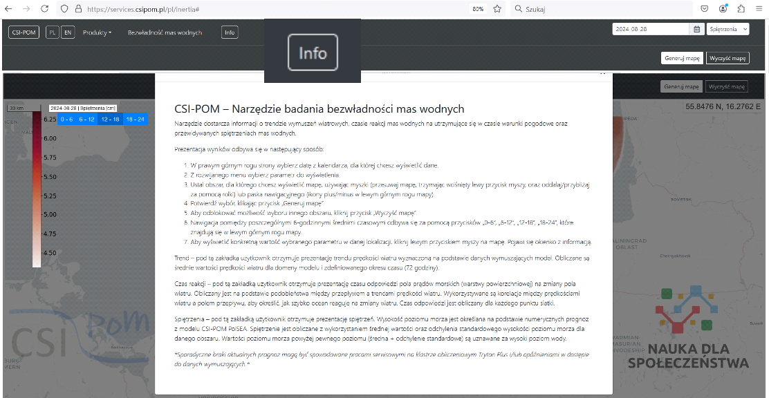 Rysunek 10. Widok okna strony CSI-POM po wybraniu ikony „Info” dla produktu „Bezwładność mas wodnych”.
