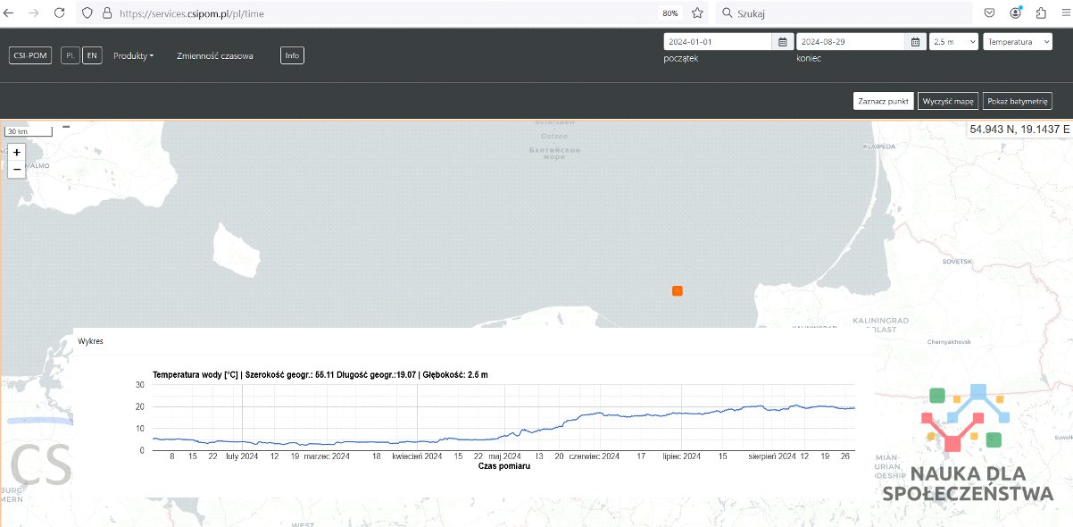 Rysunek 3. Widok okna strony CSI-POM po wybraniu produktu „Parametry hydrodynamiczne” i parametru „Temperatura” oraz daty i głębokości warstwy.