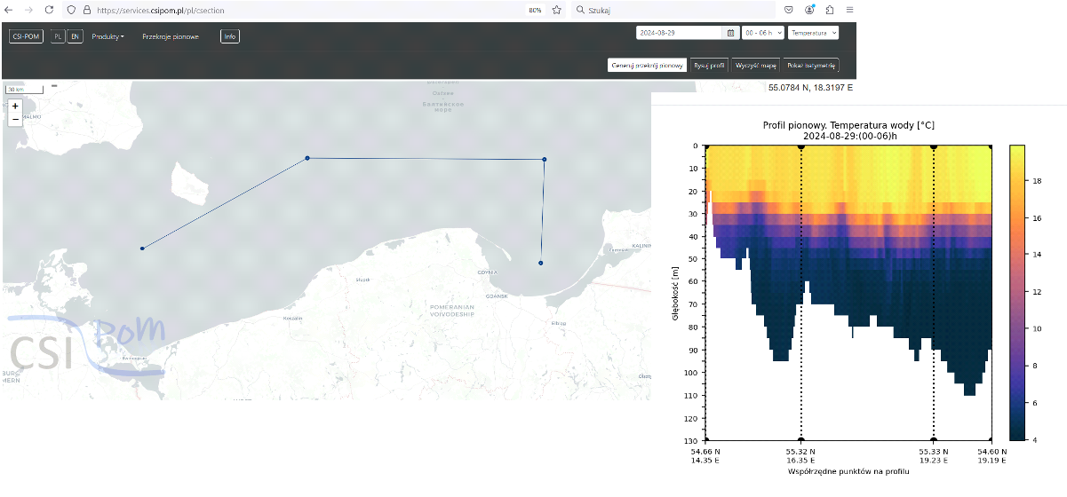 Rysunek 5. Widok okna strony CSI-POM po wybraniu produktu „Przekrój pionowy”, parametru „Temperatura”, daty i narysowaniu profilu, wzdłuż którego został wygenerowany przekrój pionowy.